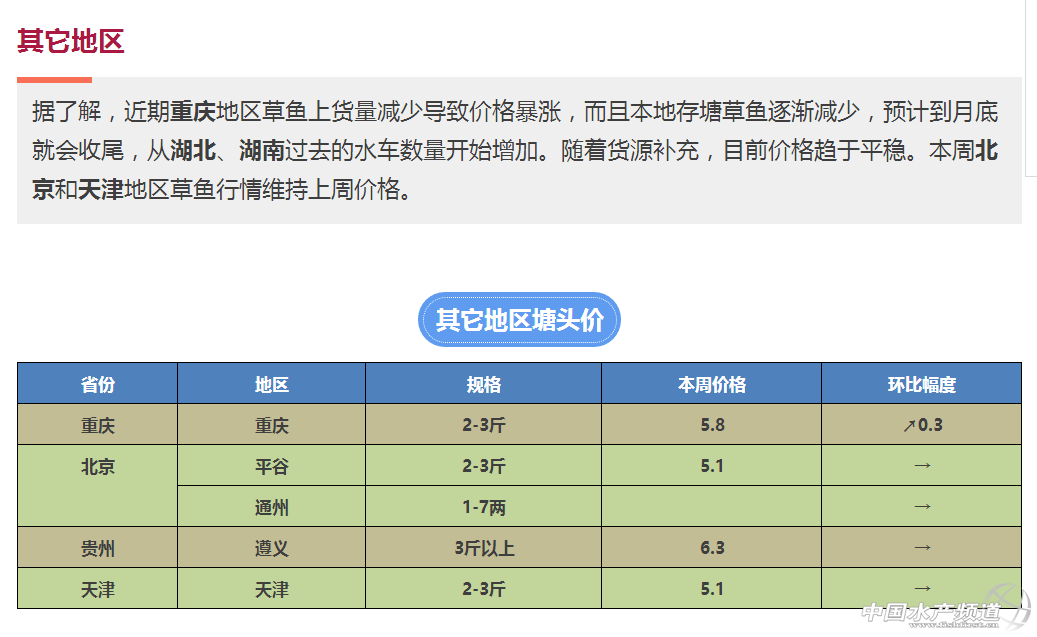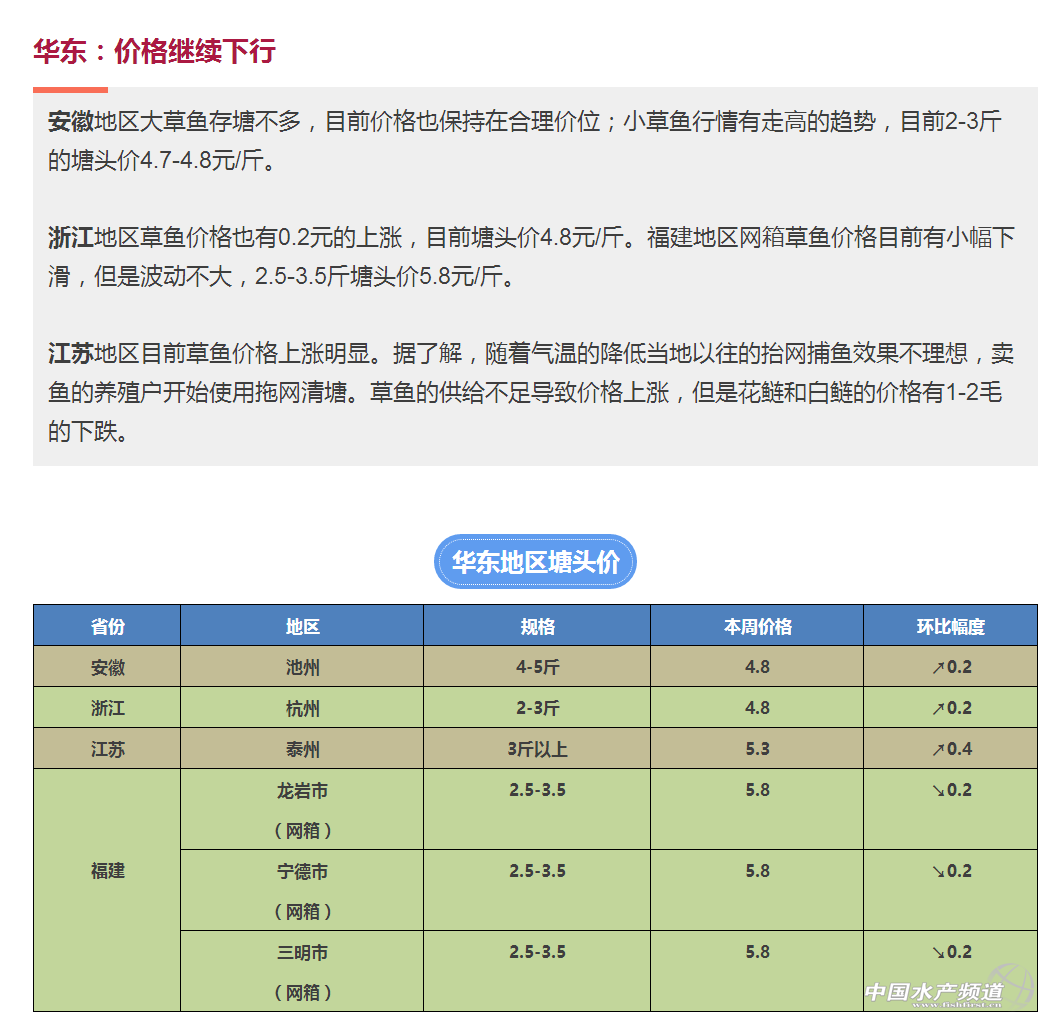 中國(guó)水產(chǎn)頻道獨(dú)家報(bào)道, 文/水產(chǎn)前沿 鄭鵬飛 隨著冬季的來臨,近期又會(huì)有一波冷空氣南下。目前東北地區(qū)中部和北部全天氣溫已經(jīng)降到了零度以下。按以往經(jīng)驗(yàn),冷空氣的來臨同時(shí)也意味著淡水魚消費(fèi)的升溫。目前江蘇、安徽、重慶等地的草魚價(jià)格有明顯上漲,湖北,福建等地價(jià)格有所下跌,廣西、珠三角、湖南等地草魚價(jià)格基本維持穩(wěn)定,部分地區(qū)有小幅波動(dòng)。 |