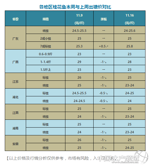 中國水產頻道獨家報道, 文/圖水產前沿李靜 養好魚,更要賣好魚 全國鱖鯪行情每周見 全國行情分析及預測 據悉,本周廣東標桂塘頭價出現小幅上漲,規格偏小或偏大的魚微跌,總體穩中略漲。標桂成數占比例較大的最高可以賣25.8元/斤,也有魚中報價26元/斤。據悉,目前因婚宴酒席較少,桂魚相對處于消費淡季,而每到年底則為消費旺季。有業內人士介紹,今年因投苗量少,且很多桂魚養殖過程中因發病而提前清塘處理,導致目前整體存塘量低于往年同期,故預計年底行情或比較可觀。 但據養殖戶反映,廣東不同地區塘頭價有些差異,清遠和英德兩地塘頭價比佛山順德要低1元/斤左右,而肇慶地區塘頭價則比佛山順德低0.3元/斤左右。比如:肇慶報價25-25.5元/斤;江門報價25-25.8元/斤;佛山三水報價25-25.3元/斤;佛山順德報價25.5-25.8元/斤;英德報價24-24.5元/斤;清遠報價24-24.5元/斤。其他六省因都有新魚陸續上市,價格微跌。 餌料魚價格:肇慶麥鯪4.1元/斤、肇慶土鯪5.0元/斤、江門麥鯪4.2元/斤、佛山土鯪4.5元/斤、高明麥鯪4.2元/斤、清遠麥鯪4.4元/斤、湖北麥鯪3.9元/斤。 【關鍵字】:桂花 報價 水產養殖 |