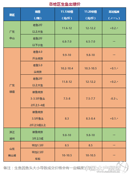 摘要: 縱觀上周廣東生魚價格,依然是2斤以上大生的老魚有0.2元/斤的上揚,魚頭大的老魚統貨價格有稍微上漲,其他規格保持不變。目前開塘依然以老魚為主、新魚為輔的局面,價格依舊是按魚頭大小定價,目前市場還是魚頭偏大的 ...