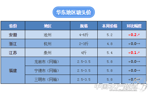 據了解,本周華東地區的草魚價格整體上也還是保持穩定,沒有太大波動,但是好消息是有部分地區也還是有明顯的升溫。其中,安徽池州地區價格上漲2毛左右,4-6斤的草魚上周塘頭價格為5元/斤,而本周基本在5.1-5.2元/斤。江蘇泰州地區4斤以上草魚目前塘頭價5.4元/斤,較上周也有0.1元的上漲。目前福建和浙江地區了解到的情況是價格沒有變化,保持上周水平。