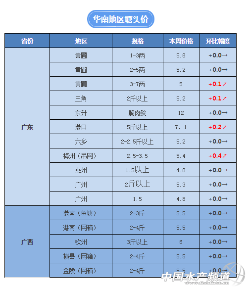 本周珠三角地區降溫非常明顯,加上零星的小雨更是有了冬天的感覺,壓箱底的秋褲也不得不派上用場。草魚行情本周的波動并不大,珠三角地區目前小草魚有價無市,價格雖然有所回升但是賣魚數量并不多,漲價對于養殖戶的意義不是很大。而4斤以上的大規格草魚上漲了2-3毛,有業內人士表示,今年大草魚的漲價比預期的要早一些;華南大部分地區整體價格上比較平穩。