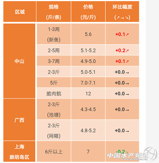中國水產頻道原創獨家報道,中山區域:魚種價格小幅上升,超市草魚近期市場銷量一般,價格持平,5斤以上存塘量少價格堅挺。