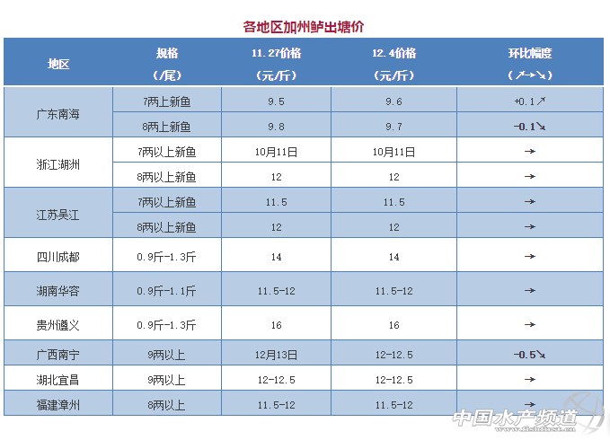 中國水產(chǎn)頻道獨家報道, 文/圖何氏水產(chǎn)、水產(chǎn)前沿李靜 加州鱸 1、廣東上周新鱸魚8兩上的開塘價再次微降0.1元/斤,而7兩以上的新魚開塘價格意外上浮了0.1元/斤。偏小規(guī)格的鱸魚有很大的需求量,但8兩上依舊是市場的主打規(guī)格。市場價格呈現(xiàn)亂象,銷量不足以拉動價格上揚,預(yù)估下周或持穩(wěn)。 2、除廣西塘頭價再次下滑0.5元/斤外,其他地區(qū)價格與上周持平。 【關(guān)鍵字】:加州鱸 塘頭價 水產(chǎn)養(yǎng)殖 |
