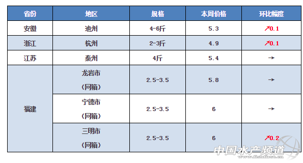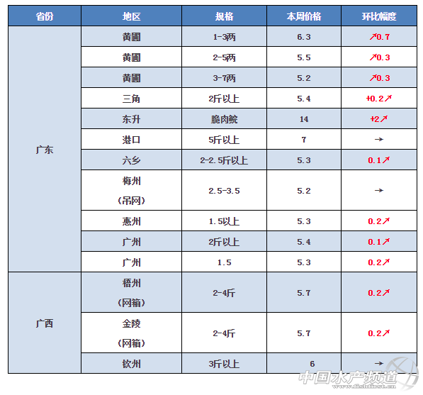 中國水產頻道獨家報道, 養得好,不如賣得好 全國草魚行情解析, 中國水產頻道與您相約每周二 文/水產前沿 鄭鵬飛 最近,又一波強勁冷空氣南下,大部分地區已經開始飄雪。據了解,廣東韶關地區都已經下起了大雪。隨著冷空氣的到來,草魚行情又按耐不住的往上躥了躥。據各地水產業內人士反映,本周珠三角地區、安徽、浙江、湖北等地有明顯的上漲勢頭,其中東升13斤以上的脆肉鯇目前報價14元/斤,上漲2元;黃圃小草魚上漲明顯,而且仍有繼續上漲的趨勢。 華南地區 隨著冷空氣的南下,廣東又開始下雪了。本周華南大部分地區草魚行情又一次被拉升,其中珠三角地區上漲最為明顯。黃圃1-3兩的小草魚目前報價6.3元/斤,比上周上漲7毛;2-5兩目前報價5.5元/斤,上漲3毛;超市鯇上漲1-2毛左右;脆肉鯇上漲2元,目前報價14元/斤;廣西地區大部分地區也有2毛左右的上漲。 華南地區塘頭價 華中地區 據了解,本周華中地區的草魚價格整體波動不大,其中湖南和江西基本保持穩定,湖北地區草魚價格相比上周有所上漲,目前2-3斤草魚塘頭價格基本在4.6-4.8元/斤,相比上周上漲了0.1-0.3元。對于資金不是非常緊張的養殖戶,目前表示惜售等待漲價。 華中地區塘頭價 華東地區 本周華東地區草魚價格整體也有小幅上漲,其中安徽池州地區2斤以上的草魚整體上有1-2毛的上漲幅度,浙江地區價格也有1毛左右的上漲。 華東地區塘頭價 其它地區 本周重慶、貴州以及北方地區草魚行情保持穩定,沒有出現波動。 其它地區塘頭價 【關鍵字】:草魚 塘頭價 水產養殖 |