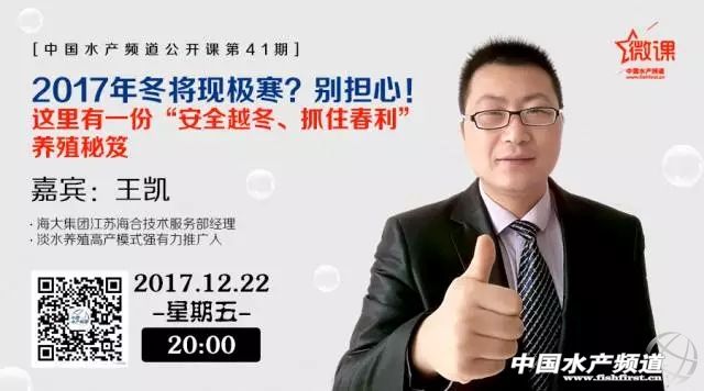 2017年12月22日20:00,蘇中、蘇北草魚模式、鯽魚主養(yǎng)模式、魚蝦混養(yǎng)模式強有力推廣人,海大集團江蘇海合技術服務部經(jīng)理王凱將做客中國水產頻道公開課課堂,與你共話:安全越冬、抓住春利!