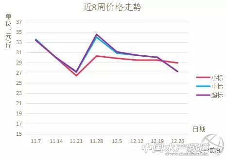 【注:一般,小標0.9-1.2斤;中標1.2-1.5斤;超標1.5-2.0斤】 從價格走勢上來看,標魚下行不大,主要是大魚下滑比較厲害。這也說明這段時間,養殖戶希望出魚回款心態還是比較迫切,所以這段時間呈現一個明顯的低谷。但是主體標魚不動,說明很多人還是押寶在了過年期間,希望那時候能夠多掙點,所以明眼人還是要擦亮眼睛。 | |||||||||||||||||||||||||||||||||||||||||||||||||||||||||||||||||||||||||||||||||||||