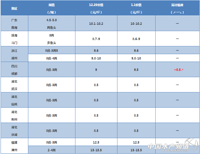 文/圖 何氏水產(chǎn)、水產(chǎn)前沿 李靜 中國水產(chǎn)頻道原創(chuàng)獨(dú)家報(bào)道,1.各地黃顙魚存量較大,導(dǎo)致廣東地區(qū)黃顙魚價(jià)格一直低迷,但在上周終于止跌。目前5.5兩以上魚頭的價(jià)格為10.5元/斤左右;4.8-5.3兩魚頭的價(jià)格為10-10.2元/斤,這也是現(xiàn)在開塘的主要規(guī)格;3-3.8兩魚頭的價(jià)格為8.6-9元/斤,預(yù)計(jì)下周下跌的可能比較小。 2.四川地區(qū)黃顙魚價(jià)格因受天氣影響,再加上節(jié)日需求量大的因素,價(jià)格上漲了0.5元/斤,其他地方保持平穩(wěn)。 各地區(qū)黃顙魚出塘價(jià) |