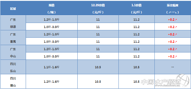 摘要: 廣東地區江團價格再次上漲了0.2元/斤,老魚幾乎清塘,新魚2.5-3斤以上規格偏少,是價格上漲的主要原因。預計下周還有上漲空間。