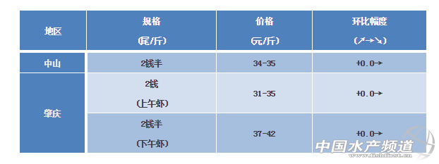 肇慶區域:肇慶蓮塘上午蝦兩錢上31-35元,下午蝦兩錢半37-42元,白土金渡下午蝦兩錢半32-38元,廣州大崗1兩上42元左右。