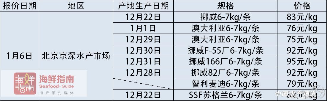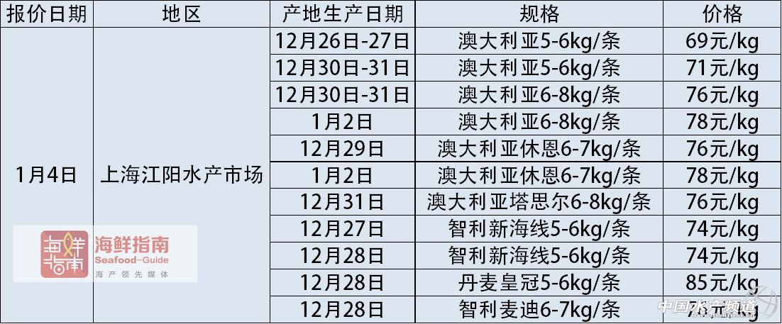 中國水產頻道獨家報道, 文/圖海鮮指南(seafood-guide)陳磊 國內主要海產市場大西洋鮭(三文魚)批發銷售價格 上周,挪威冰鮮三文魚通關問題依舊沒有得到解決,市場上流通的挪威冰鮮三文魚有明顯的減少,預計春節后才有可能緩解。同時澳大利亞的冰鮮三文魚有明顯的漲價,上海1月4日產6-8kg/條的價格已經賣到90元/公斤,少量的挪威冰鮮三文魚的價格也在90元/公斤以上。法羅群島的貨上周在市場的流通量偏少。 2018年1月7日: 2018年1月6日: 2018年1月5日: 2018年1月4日: 注明:以上價格為各地水產市場冰鮮三文魚(大西洋鮭)的市場批發銷售價格,非零售價格。產地生產日期表示:大西洋鮭從養殖場捕撈并加工完成的日期。大西洋鮭品牌中英文注釋:“澳大利亞休恩”即為:Huon;“澳大利亞塔斯爾”即為:Tassal;“智利新海線”即為:New World Currents;“智利麥迪”即為:Multierport Foods;“丹麥皇冠”即為:Bakkafrost;“SSF蘇格蘭”即為:Scottish Sea Farms;“挪威耕!奔礊椋篗arine Harvest。 《海鮮指南》編輯部三文魚報價欄目定期發布最新的市場行情和數據,為廣大海產人提供數據參考。如果你所在的市場有相關三文魚的報價信息或新聞可以提供,歡迎聯系:陳先生:18819465417(微信同號),郵箱:cl fishfirst.cn。 溫馨提示: 以上價格行情由“海鮮指南”統計整理發布,僅供參考。市場有風險,交易需謹慎。 【關鍵字】:三文魚 行情 報價 水產養殖 |