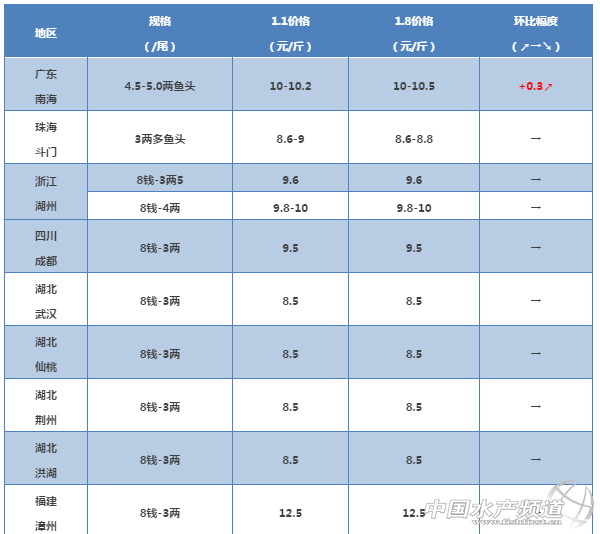 中國(guó)水產(chǎn)頻道獨(dú)家報(bào)道, 低溫出塘率低,多地魚價(jià)飆升! 文/圖 何氏水產(chǎn)、水產(chǎn)前沿 李靜 黃顙魚 1.廣東地區(qū)上周黃顙魚依然是按魚頭規(guī)格定價(jià),5兩以上魚頭的價(jià)格上漲了0.3元/斤,4.5兩魚頭的價(jià)格9.8-10.2元/斤,4兩魚頭的價(jià)格9.5元/斤,3兩-3.5兩魚頭的價(jià)格8.7-8.8元/斤。偏大規(guī)格的魚偏少,老魚接近尾聲,新魚規(guī)格偏小,現(xiàn)在魚塘規(guī)格大部分是0.8兩-2兩魚頭,預(yù)估下周5兩魚頭有上漲空間。 2.其他地區(qū)的價(jià)格變化不大。 各地區(qū)黃顙魚出塘價(jià) 備注:黃顙魚因魚頭大小與3兩上大骨所占的具體比例導(dǎo)致成交價(jià)格會(huì)有一定幅度波動(dòng) 【關(guān)鍵字】:黃顙魚 價(jià)格 水產(chǎn)養(yǎng)殖 |