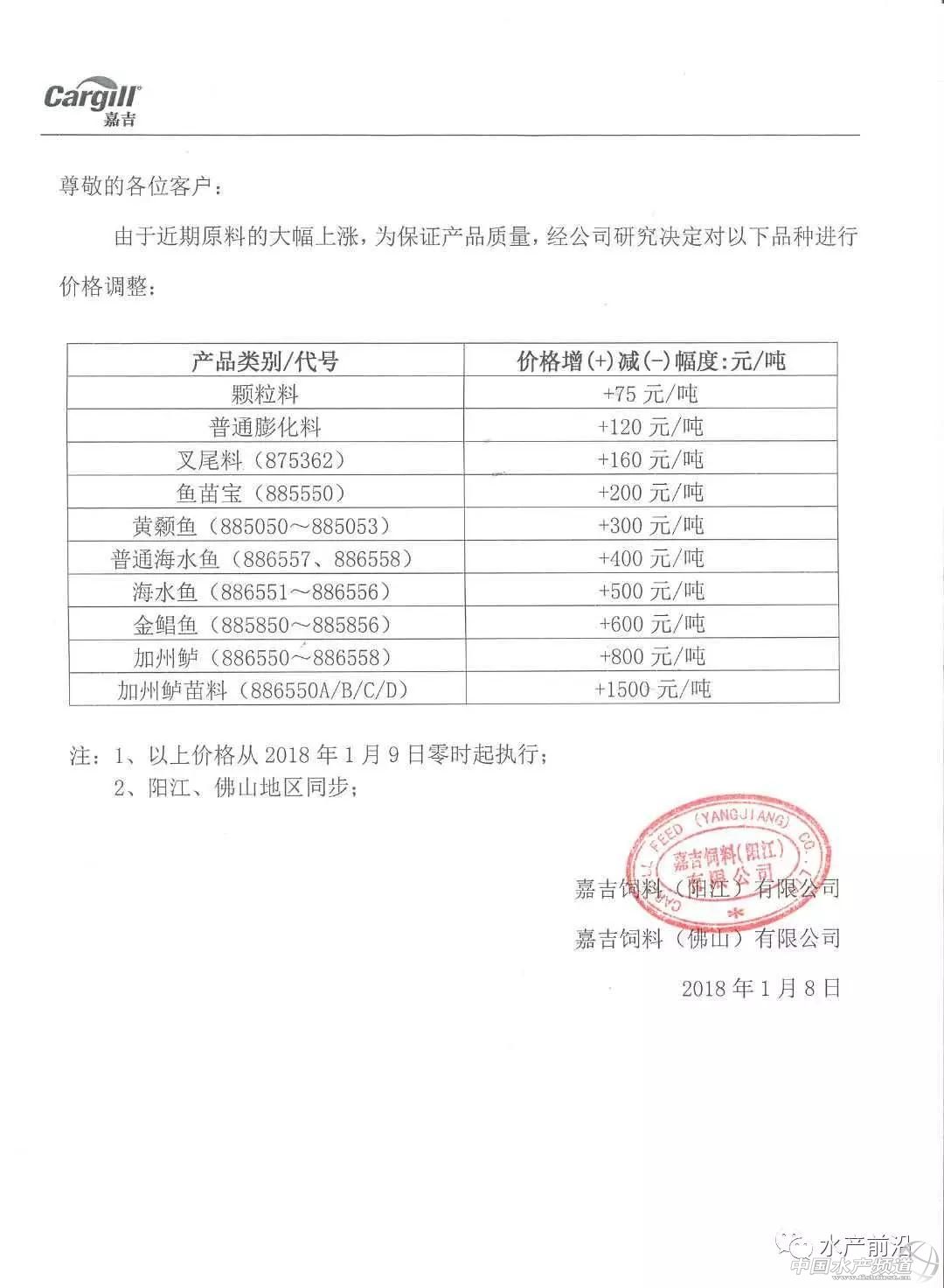 中國水產(chǎn)頻道獨家報道, 加州鱸飼料到底還是漲價了,先行的是嘉吉,下一個是誰? 文 水產(chǎn)前沿 何鴻浩 魚粉原料價格一路高漲,各飼料企業(yè)都對產(chǎn)品進行了價格調(diào)整,品種涉及蝦料、海水魚料、淡水魚料、特種水產(chǎn)料等。在各品種飼料全面上漲的時候,但魚粉用量大的加州鱸飼料卻仍未漲價。此前有消息傳出,加州鱸飼料未提價是因為各企業(yè)在漲價幅度上未達成共識,所以暫未漲價。昨日,嘉吉公司公布飼料價格調(diào)整通知。 嘉吉表示,由于近期原料價格的大幅上漲,為了保證產(chǎn)品的質(zhì)量,最終決定對幾個品種的飼料進行價格調(diào)整。其中,價格調(diào)整的飼料品種包括了加州鱸飼料與加州鱸苗飼料。 目前,加州鱸料已有企業(yè)開始漲價,海大、統(tǒng)一、杰大等各飼料企業(yè)又將有何動作,我們將會繼續(xù)關(guān)注。 嘉吉飼料價格調(diào)整通知: 【關(guān)鍵字】:飼料 價格調(diào)整 水產(chǎn)養(yǎng)殖 |