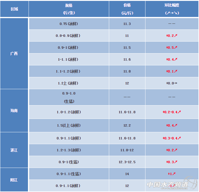 文/ 粵海飼料集團(tuán)、中國(guó)水產(chǎn)頻道 彭曉君 中國(guó)水產(chǎn)頻道原創(chuàng)報(bào)道,廣西區(qū)域:隨著氣溫變冷,金鯧魚(yú)存量有所減少,本周金鯧冰鮮價(jià)格繼續(xù)堅(jiān)挺,除了1.2斤/條以上規(guī)格金鯧冰鮮價(jià)格與上周持平外,0.8-1.2斤/條規(guī)格金鯧冰鮮價(jià)格保持強(qiáng)勁上揚(yáng)。雖然漲勢(shì)喜人,但冰鮮成交量較低,每天抓魚(yú)量有限,要排隊(duì)等抓魚(yú),屬于有價(jià)無(wú)市。能走量大的凍品價(jià)格已經(jīng)長(zhǎng)時(shí)間毫無(wú)起色。具體報(bào)價(jià):200/300克的8元/斤跌0.25元;300/400克的8.75元/斤平;400/500克的10元/斤漲0.25元;500/600克的10.5元/斤平;600/700克的11元/斤平;700/800克的11.5元/斤平。欽州防城魚(yú)排存魚(yú)少,其他規(guī)格沒(méi)人出魚(yú),價(jià)格無(wú)法統(tǒng)計(jì)。受低溫影響,欽防地區(qū)的過(guò)冬魚(yú)吃料較少。 海南、陽(yáng)江、湛江區(qū)域:價(jià)格略有上漲。 ※上述報(bào)價(jià)可能會(huì)因區(qū)域、規(guī)格、品質(zhì)和時(shí)間等因素的不同而會(huì)產(chǎn)生差異,在此僅供參考。 |