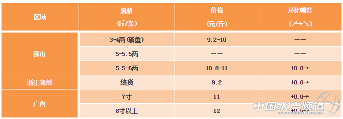 文/ 粵海飼料集團(tuán)、中國(guó)水產(chǎn)頻道 彭曉君 中國(guó)水產(chǎn)頻道原創(chuàng)報(bào)道,佛山區(qū)域:西樵舊魚(yú)存塘量不多,新魚(yú)開(kāi)始少量出魚(yú),新魚(yú)3-4兩價(jià)格9.2-10/斤左右,舊魚(yú)5兩半以上10.8-11元/斤左右,新魚(yú)價(jià)格上漲2-3毛;水溫低,吃料較少,病害相對(duì)少,部分有出血,水霉. 浙江湖州區(qū)域:魚(yú)價(jià)與上期持平,天氣氣溫低,處于停料階段,適價(jià)而出。 廣西區(qū)域:近段時(shí)間天氣較冷,消費(fèi)市場(chǎng)打火鍋等習(xí)慣對(duì)大規(guī)格黃顙魚(yú)需求旺盛,黃顙魚(yú)價(jià)格較堅(jiān)挺。 ※上述報(bào)價(jià)可能會(huì)因區(qū)域、規(guī)格、品質(zhì)和時(shí)間等因素的不同而會(huì)產(chǎn)生差異,在此僅供參考。 |