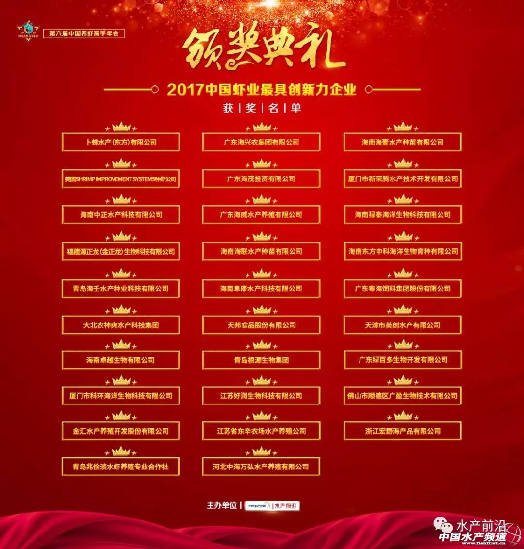 中國水產(chǎn)頻道獨(dú)家報(bào)道, 2018年1月25-26日,第六屆中國養(yǎng)蝦高手年會(huì),在海口香格里拉大酒店隆重舉行。會(huì)議由水產(chǎn)前沿雜志、中國水產(chǎn)頻道聯(lián)合主辦,美國蝦改良系統(tǒng)公司(SHRIMP IMPROVEMENT SYSTEMS,簡稱SIS)協(xié)辦。國內(nèi)外學(xué)者、前沿企業(yè)和養(yǎng)蝦高手共400多人參會(huì),其中過半是一線的養(yǎng)蝦高手。20多位嘉賓為大會(huì)呈現(xiàn)了11個(gè)養(yǎng)蝦業(yè)最前沿報(bào)告,2個(gè)主題互動(dòng)。國家蝦蟹產(chǎn)業(yè)技術(shù)體系首席科學(xué)家何建國教授,美國蝦改良系統(tǒng)公司(簡稱SIS)亞洲區(qū)總裁鄭光發(fā)先生,海興農(nóng)集團(tuán)江謝武先生,正大集團(tuán)農(nóng)牧食品企業(yè)(中國區(qū))副董事長陳丹先生,廣東粵海飼料集團(tuán)副總裁曾明仔先生、武漢新華揚(yáng)生物股份有限公司總裁吳學(xué)軍先生、廈門市新榮騰水產(chǎn)技術(shù)開發(fā)有限公司董事長杜劍榮先生等重要嘉賓到會(huì)。【詳情請點(diǎn)擊:今天,是養(yǎng)蝦最成功者的聚會(huì),未來養(yǎng)蝦會(huì)更好,因?yàn)槲覀兘K于找到組織了】 大會(huì)同時(shí)得到了青島海壬水產(chǎn)種業(yè)科技有限公司、福建源正龍(金正龍)生物科技有限公司、泰國海灣種蝦公司、武漢新華揚(yáng)生物股份有限公司的鼎力支持。 國家蝦蟹產(chǎn)業(yè)技術(shù)體系細(xì)菌病防控崗位黃倢研究員、中國科學(xué)院海洋研究所研究員王雷博士、中國水產(chǎn)科學(xué)研究院黃海所欒生研究員、江蘇省海洋水產(chǎn)研究所萬夕和研究員、廣東海洋大學(xué)孫成波教授、廣東海洋大學(xué)杜國平、廣東海洋大學(xué)魯義善教授、珠江水產(chǎn)研究所退休研究員林文輝、法國生物絮團(tuán)養(yǎng)殖專家Manuel Poulain先生、厄瓜多爾育苗專家Alfredo Medina先生,等業(yè)內(nèi)知名專家出席了本次會(huì)議。 出席大會(huì)的行業(yè)重要人士還有:海南省對蝦養(yǎng)殖協(xié)會(huì)會(huì)長王博文先生、青島海壬水產(chǎn)種業(yè)科技有限公司總經(jīng)理于明超博士、福建源正龍(金正龍)生物科技有限公司董事長陳藝平先生、泰國海灣種蝦公司CEO袁健國先生、海興農(nóng)海洋生物科技有限公司總經(jīng)理李輝先生、英偉中國區(qū)總經(jīng)理柴宇博士、海南中正水產(chǎn)科技有限公司董事長雷夏雨先生與總經(jīng)理王平先生、海南海壹水產(chǎn)種苗有限公司總經(jīng)理黃明先生、湛江市對蝦苗種協(xié)會(huì)會(huì)長彭樹鋒先生,如東縣南美白對蝦協(xié)會(huì)秘書長石明山先生、新華揚(yáng)集團(tuán)水產(chǎn)技術(shù)總監(jiān)吳建軍博士、新生代工廠化養(yǎng)蝦達(dá)人李濤先生、河北中海萬弘水產(chǎn)養(yǎng)殖有限公司總經(jīng)理肖娜思先生等。 廣東海興農(nóng)集團(tuán)有限公司、湛江粵海水產(chǎn)種苗有限公司、廣東海威水產(chǎn)養(yǎng)殖有限公司、海南中正水產(chǎn)科技有限公司、海南祿泰海洋生物科技有限公司、海南泰陽種業(yè)有限公司、江蘇好潤生物科技有限公司、廣東綠百多生物開發(fā)有限公司、天津市英創(chuàng)水產(chǎn)有限公司、唐山三發(fā)普林飼料有限公司、佛山市順德區(qū)廣盈生物技術(shù)有限公司、比利時(shí)英偉水產(chǎn)集團(tuán)、湛江騰飛實(shí)業(yè)有限公司、湛江市科海科技有限公司(漁財(cái)寶)、滄州正大生物制品股份有限公司等企業(yè),為本次年會(huì)的順利舉辦提供了贊助。 此外,還有眾多業(yè)內(nèi)知名企業(yè)參加論壇同期的展會(huì),包括長迎養(yǎng)殖設(shè)備工程(上海)有限公司、中海萬弘(惠州)生物科技有限公司、廈門市科環(huán)海洋生物科技有限公司、海南豪力環(huán)境工程有限公司、青島根源生物技術(shù)集團(tuán)有限公司、杭州眾測生物科技有限公司、佛山市百瑞生物科技有限公司、泰國頂豐水產(chǎn)養(yǎng)殖有限公司、廣州雙螺旋基因技術(shù)有限公司、徐聞縣海源養(yǎng)殖有限公司、亞丁國際海洋生物科技有限公司、海南綠量微藻生物技術(shù)有限公司、黃驊市金匯水產(chǎn)養(yǎng)殖開發(fā)股份有限公司。 “中國養(yǎng)蝦高手年會(huì)”是當(dāng)下中國養(yǎng)蝦業(yè)者最重要的年度聚會(huì),迄今為止舉辦了六屆,并逐步成為中國養(yǎng)蝦人與全球養(yǎng)蝦支撐體系的交流與對話平臺。 經(jīng)過前期的提名推薦與自主報(bào)名,網(wǎng)絡(luò)投票,專家投票等環(huán)節(jié),“2017中國最具創(chuàng)新力十大養(yǎng)蝦人”,“2017中國蝦業(yè)最具創(chuàng)新力企業(yè)”新鮮出爐,并在大會(huì)的晚宴環(huán)節(jié)隆重揭曉。 “2017中國最具創(chuàng)新力十大養(yǎng)蝦人”名單 (排名不分先后) 江蘇南通如東 鮑桂生 海南 符揚(yáng) 山東威海乳山口 李濤 上海崇明島 陸海濱 天津?qū)氎?曹鵬 浙江寧波 李來國 山東濰坊寒亭 王旭洋 天津市寧河 李崇喜 山東海陽 包希平 海口西秀榮山 陳垂吉 “2017中國蝦業(yè)最具創(chuàng)新力企業(yè)” (排名不分先后) 卜蜂水產(chǎn)(東方)有限公司 廣東海興農(nóng)集團(tuán)有限公司 海南海壹水產(chǎn)種苗有限公司 美國SHRIMP IMPROVEMENT SYSTEMS種蝦公司 廣東海茂投資有限公司 廈門市新榮騰水產(chǎn)技術(shù)開發(fā)有限公司 