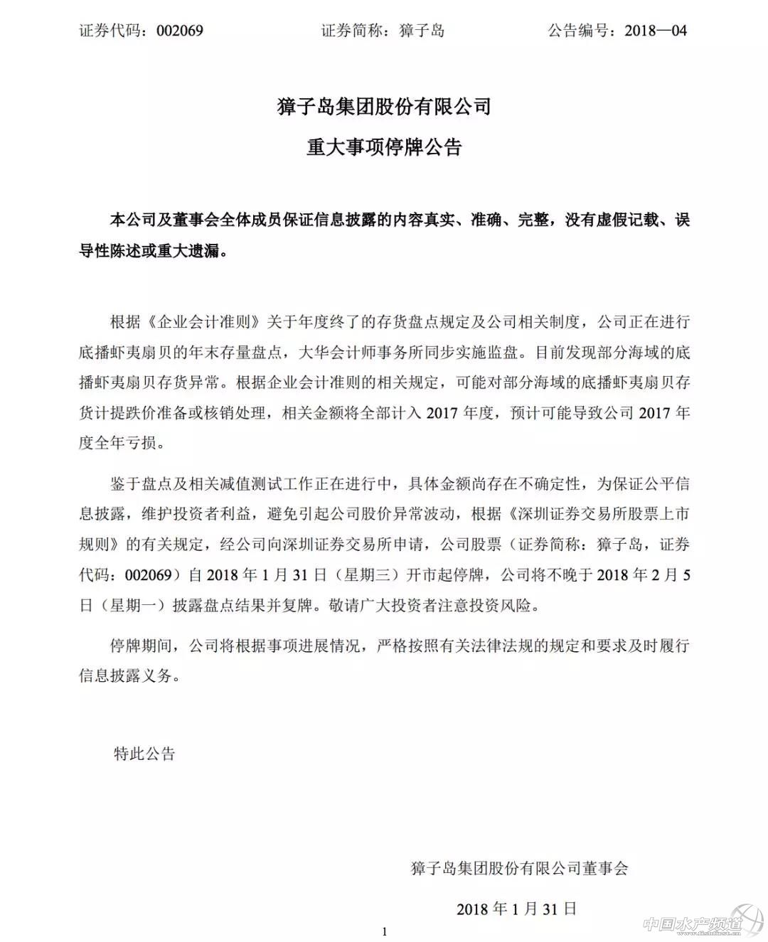 中國水產頻道獨家報道, 獐子島集團股份有限公司因重大事項停牌,部分海域的底播蝦夷扇貝存貨異常。 文/海鮮指南(seafood-guide)沈基文 獐子島昨日晚間發布了2017年度業績預告修正公告和重大事項停牌公告。 重大事項公告稱,公司正在進行底播蝦夷扇貝的年末存量盤點,目前發現部分海域的底播蝦夷扇貝存貨異常,可能對部分海域的底播蝦夷扇貝存貨計提跌價準備或核銷處理,預計可能導致公司2017年度全年虧損。 在另一份公告中,公司預計去年業績虧損5.3億至7.2億元,而上一年度公司同期實現盈利0.8億元。 公告顯示,2017年四季度,受底播蝦夷扇貝肥滿度下降,境外扇貝產品沖擊國內市場,對公司扇貝類產品的收入、毛利影響較大,底播蝦夷扇貝收入及毛利下滑,部分庫存扇貝類產品出現減值;以及匯率波動對海外公司和出口業務造成沖擊,導致公司四季度業績與原業績預測偏差較大。 獐子島位于遼寧省大連市,主要從事水產品養殖、捕撈、銷售,以及進出口等業務。值得一提的是,這并不是獐子島第一次出現“蝦夷扇貝存貨異常”的情況。2014年10月14日,獐子島集團突然宣布停牌。半個月后,獐子島集團披露:2011年底播海域為119.1萬畝、2012年底播海域為29.56萬畝的蝦夷扇貝,因受冷水團異動導致的自然災害影響,蝦夷扇貝近乎絕收。獐子島集團巨虧8.12億元。此公告一出,市場嘩然,紛紛調侃獐子島上演了一出“扇貝去哪兒”的戲碼。 海鮮指南在求證此事并咨詢詳細情況時,獐子島方面稱,具體參見公告,公司將不晚于2月5日披露盤點結果并復牌。 【關鍵字】:獐子島 蝦夷扇貝 水產養殖 |