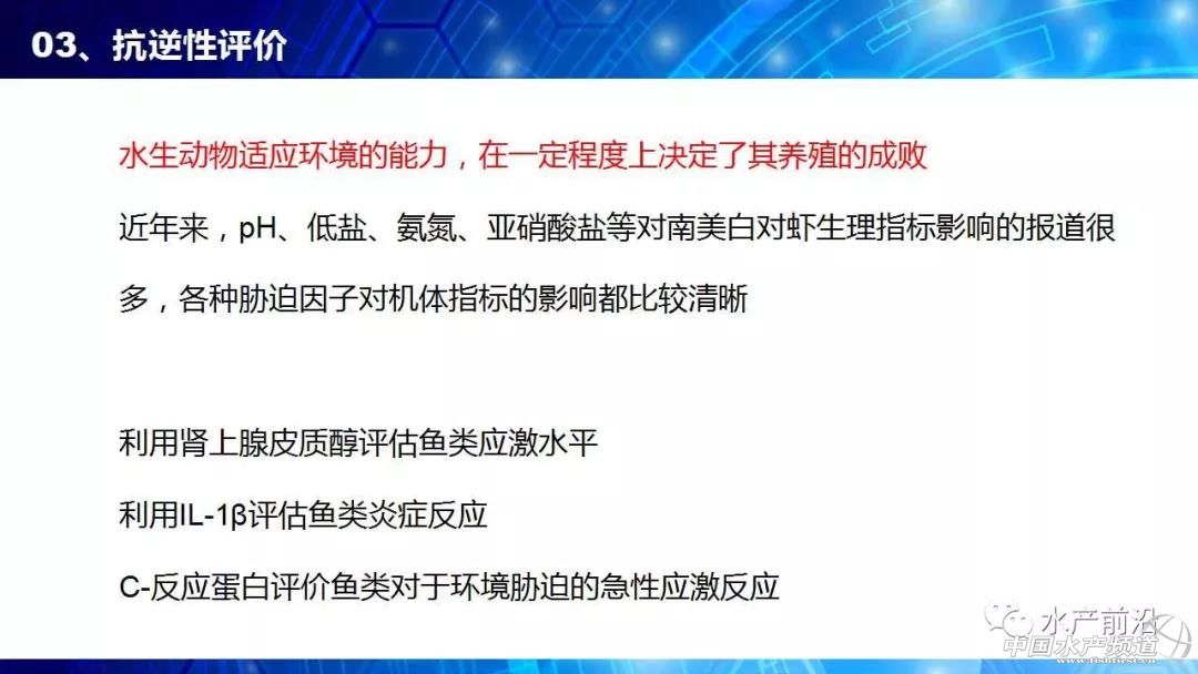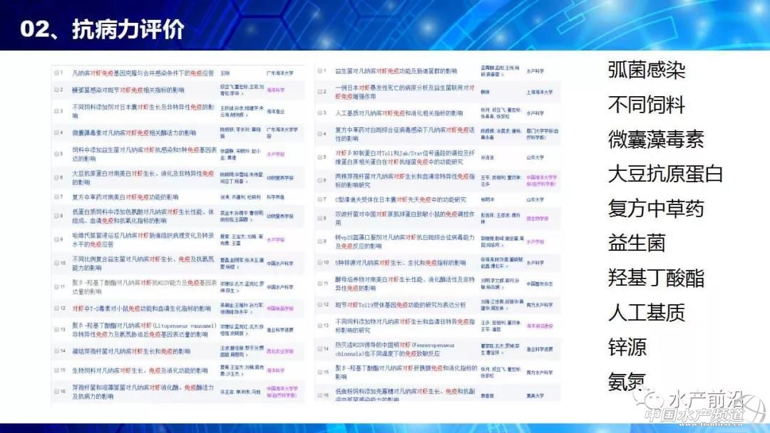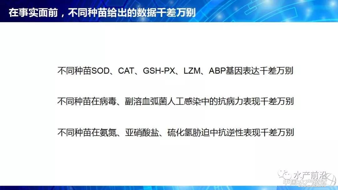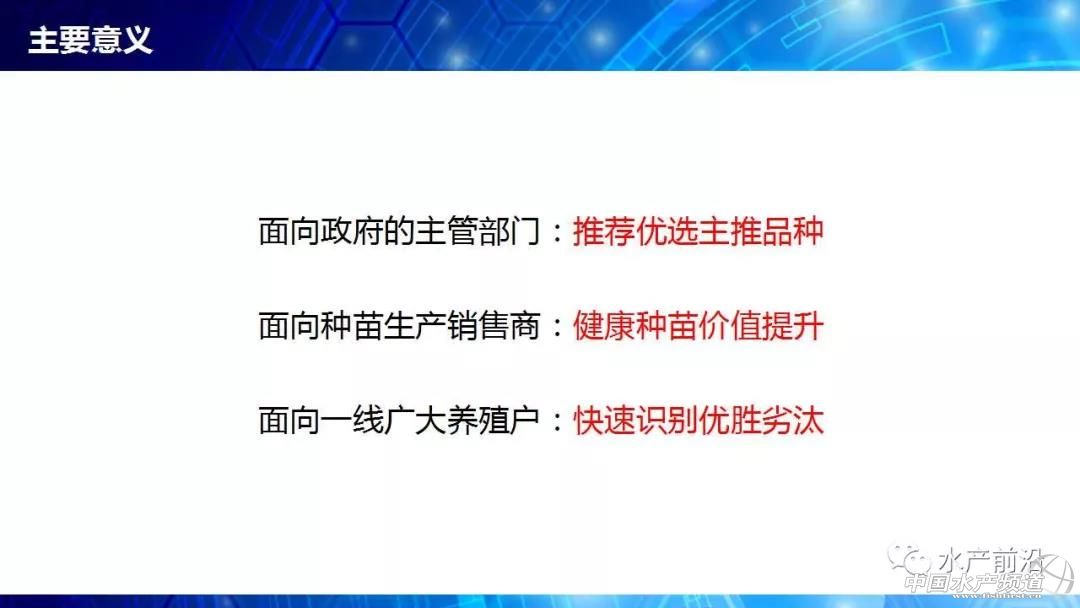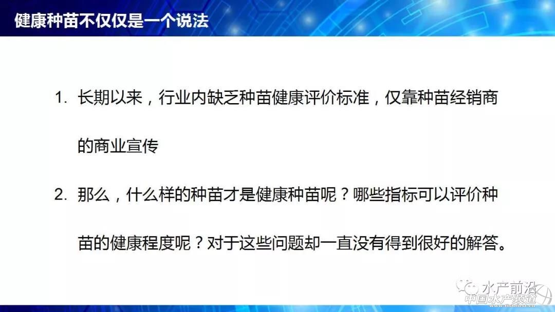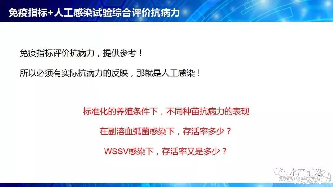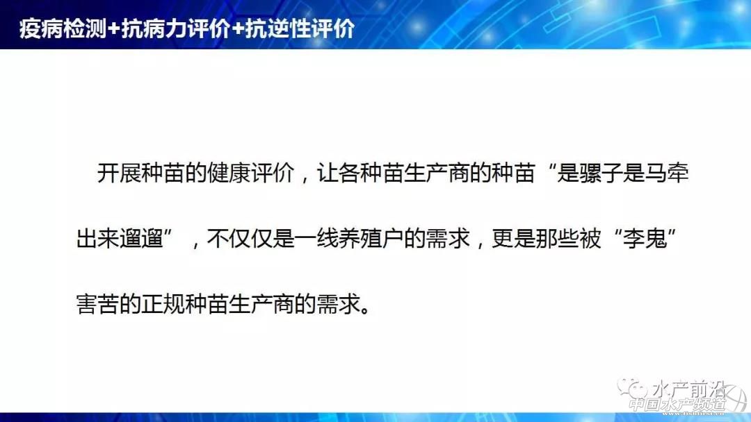 廣東海洋大學(xué) 魯義善教授 中國水產(chǎn)頻道原創(chuàng)報道,能不能養(yǎng)看種苗、養(yǎng)大養(yǎng)小看飼料、養(yǎng)好養(yǎng)壞看病害。會上,廣東海洋大學(xué)教授魯義善博士提出疑惑,長期以來,行業(yè)內(nèi)缺乏種苗健康評價標(biāo)準(zhǔn),僅靠種苗經(jīng)銷商的商業(yè)宣傳。那么,什么樣的種苗才是健康種苗?哪些指標(biāo)可以評價種苗的健康程度?對于這些問題卻一直沒有得到很好的解答。 由于業(yè)界內(nèi)對健康種苗的指標(biāo)并不明確,即使是簡單的SOD酶活力也有許多說法。所以行業(yè)需要推動種苗健康評價,內(nèi)容包括疫病檢測、抗病力評價和抗逆性評價。2011年,我國印發(fā)“農(nóng)業(yè)部關(guān)于印發(fā)《魚類產(chǎn)地檢疫規(guī)程(試行)》等3個規(guī)程的通知”,標(biāo)志著我國啟動了水產(chǎn)苗種產(chǎn)地檢疫工作。 對蝦病害越來越繁雜,相應(yīng)的檢測方法也相繼出現(xiàn)。研究人員也針對性的開展免疫力試驗(yàn),發(fā)現(xiàn)凡納濱對蝦各組織中免疫指標(biāo)隨亞硝酸鹽氮、總氨氮等濃度的轉(zhuǎn)變有很明顯變化。然而,免疫指標(biāo)評價抗病力,只是提供參考。必須有實(shí)際抗病力的反映,那就是人工感染。 開展種苗的健康評價,讓各種苗生產(chǎn)商的種苗“是騾子是馬牽出來遛遛”,不僅僅是一線養(yǎng)殖戶的需求,更是那些被“李鬼”害苦的正規(guī)種苗生產(chǎn)商的需求。未來,大數(shù)據(jù)將帶來健康評價的深入變革。 更多詳細(xì)內(nèi)容,請閱讀PPT內(nèi)容。至此,小編不再贅述,附上PPT原件供大家參考,請勿抄襲或盜用報告嘉賓的原創(chuàng)內(nèi)容,謝謝! |