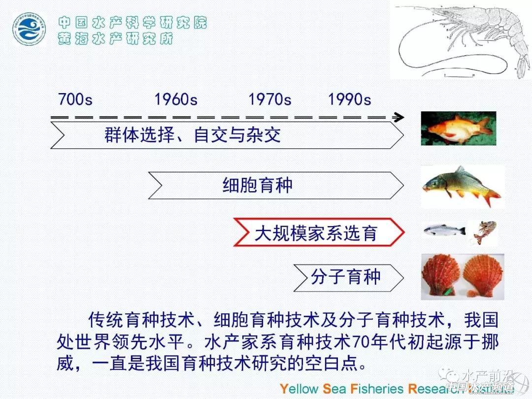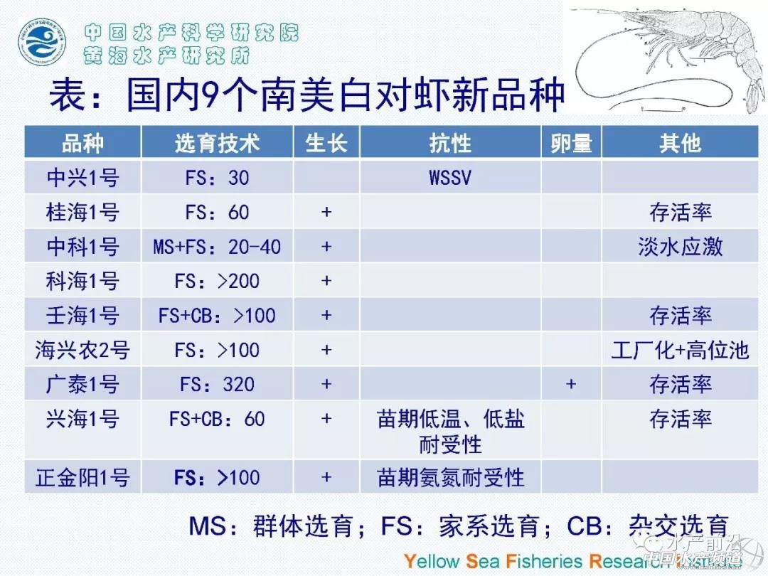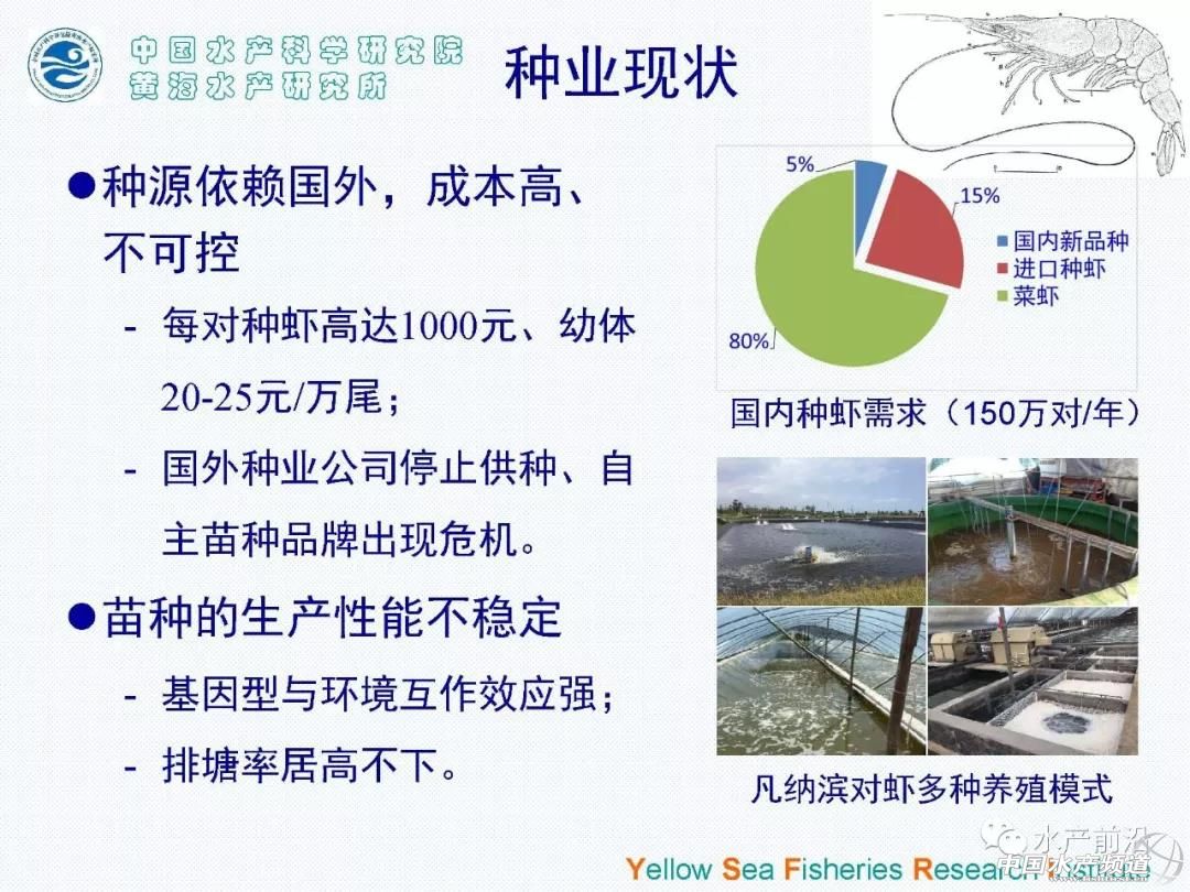 中國水產科學研究院黃海水產研究所 欒生研究員 中國水產頻道原創報道,會前,小編們到全國多個南美白對蝦主養區走訪,眾多蝦農都表示選蝦苗就像在賭博,好壞全憑運氣,排塘率居高不下。是環境變化?種質退化?還是“外國種”不適應國內環境?本土化選育能解決這個問題?會上,中國水產科學研究院黃海水產研究所欒生研究員對南美白對蝦種蝦家系選育研究進展及發展趨勢進行分析,對國內外親蝦的情況進行介紹。 這幾年,正大、科拿灣、夏威夷SIS和新加坡SIS等品種占領了大部分的蝦苗市場。當前,國內種蝦需求量大約是150萬對/年,而我國南美白對蝦種源高度依賴國外,每對種蝦高達1000元、幼體20-25元/萬尾,成本高、不可控。國內對蝦新品種雖然逐步引起大家的重視,但只占了大約5%的比例。一旦出現國外種業公司停止供種的情況,自主苗種品牌就會出現危機。 其實,在傳統育種技術、細胞育種技術及分子育種技術上,我國處世界領先水平。但水產家系育種技術70年代初起源于挪威,一直是我國育種技術研究的空白點。為了填補這方面的空白,2004年6月5日,中挪水產育種合作項目“水產養殖動物多性狀復合育種技術的引進與示范”在中國水產科學研究院黃海水產研究所簽定。 目前,研究機構也在破解“有種、缺繁、少推廣”的產業難題,建立數據庫,制定配種和擴繁方案。 至此,小編不再贅述,附上PPT原件供大家參考,請勿抄襲或盜用報告嘉賓的原創內容,謝謝! |