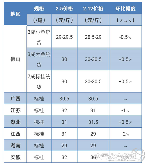 文/圖 何氏水產(chǎn)、中國水產(chǎn)頻道 李靜 中國水產(chǎn)頻道原創(chuàng)報道,1.天氣回暖,年關(guān)將近,在各大水產(chǎn)公司都已經(jīng)準(zhǔn)備了充足貨源的情況下,桂魚市場價格并沒有大漲。反而偏小規(guī)格下跌了0.5元/斤,7成標(biāo)桂和3成左右大魚的價格上漲了0.5元/斤。 2.現(xiàn)在開塘依然按規(guī)格大小打價格,7成標(biāo)桂是市場主打規(guī)格,價格為30-30.5元/斤;3成左右偏大規(guī)格因年前北方城市備貨上漲了0.5元/斤,現(xiàn)價格為30-30.5元/斤。預(yù)估偏大規(guī)格有下跌趨勢,過年銷售小魚的城市都改為了標(biāo)桂,所以流通商收購小魚回來只能虧本拋售,3成小魚的價格為28.5-29元/斤。 3.受年前養(yǎng)殖戶扎堆賣魚的影響,江西、安徽、江蘇等地分別跌了1-2元/斤,其他地區(qū)價格整體變化不大。 |