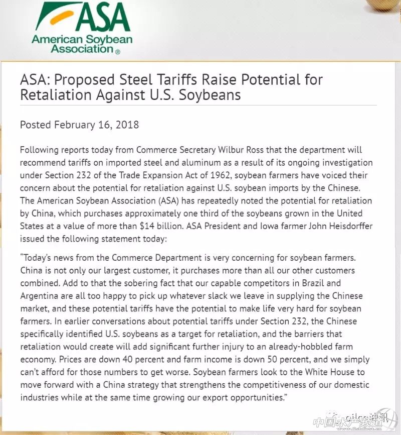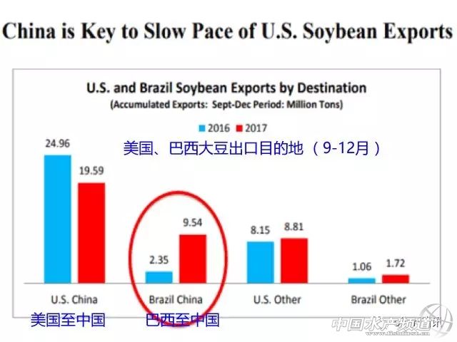 中國水產頻道綜合整理報道, “豆爭”是中外油世界的核心焦點,發生在企業與企業之間,乃至國與國之間。進入2018年,一場超級“豆爭”正在逼近..... “中美經濟一旦擦槍走火,大豆或將是中方有力的反制武器”--這類推演在特朗普在上任美國總統后,一再出現于民間輿論你來我往的嘴仗中,而就在2018農歷春節前后,有了動真格的架勢,這一次,狼是否真的來了? 然而,對于水產養殖戶來說,這或者不是一個好消息...... 目前雨水節氣已來,預示著將進入新一年的水產養殖旺季。而之前秘魯魚粉價格已高企,現在美國大豆或將卷進貿易風波,可能會致中國進口美國大豆數量銳減,國內的大豆(豆粕)價格會不會飆漲,使原來的原料成本增加基礎上再加碼?2018年水產養殖旺季即將拉開帷幕,飼料大幅漲價難道是“箭在弦上”嗎? 回顧上月,魚粉漲價導致飼料價格大規模上調 2018年1月時,正值水產養殖淡季,但由于頂不住魚粉價格暴漲的壓力,各大小飼料企業紛紛上調飼料價格,從南到北,涉及的品種之多,漲價潮頻繁地一波接一波襲擊,實屬歷史罕見。 詳情點擊: 重磅!加州鱸料飆漲最高1500元/噸!全面漲價近在眼前? 1月6日最高漲1000元/噸,珠三角100萬噸特種水產料市場暗流涌動 珠三角水產料漲價在即!海鱸料預估提價500-600元/噸 珠三角特種水產料定價權大易主!現在屬于這兩家飼料企業 魚粉瘋漲致水產飼料企業陷入被動,10余家主流飼料企業擬于12月1日商量對策 中美貿易戰是否會燃至大豆?美國豆農算賬要虧50%,直呼傷不起! 2月16日是中國的大年初一,美國大豆協會的官網急急掛出一則聲明,因為這一天美國商務部公布了對進口鋼鐵和鋁產品的安全調查報告,建議將對中國等國征收高額關稅,被視為特朗普狗年打響的貿易戰第一槍。 之前,特朗普已經對中國打響了兩槍:1月底,對進口中國洗衣機和太陽能電池板征收的高額關稅;中國回擊的一槍是對原產美國的進口高粱進行反傾銷立案調查; 2月14日美商務部又宣布中國進口的鑄鐵污水管配件存在傾銷行為,將征收高幅度保證金。 特朗普政府在一個月內,密集對中國出口到美國的產品進行扣響扳機,國內外輿論四起,普遍認為隨著摩擦升級,大豆很可能是中國瞄準的首個真正目標。 甚至連目標本人也覺得危在旦夕,趕緊表態不當炮灰。 美大豆協會官網原文 美國大豆協會在聲明中稱: 大豆種植戶對商務部的決定深感憂慮,中國是我們最大的客戶,購買了美國近三分之一價值140億美元的大豆,其購買量比我們所有其他客戶的總和還要多!何況強大的競爭對手巴西和阿根廷將樂得搶奪我們讓出的份額。 如果對鋼鐵和鋁產品征稅,會令大豆種植戶陷入困境。中方態度已明確顯示大豆將成為反擊報復的目標,這將令目前已經萎靡不振的豆業雪上加霜。 價格將下跌40%,農場收入將減少50%,我們真的傷不起!...... 美國中西部州是對華大豆出口大州,也是共和黨的票倉和特朗普支持者的大本營 美國農民這么著急先舉了白旗,是因為大豆的子彈早已飛起,著實疼在了自己身上,沒有誰比他們更清楚:這一次,中國可能要來真的了! 自2018年1月1日,中國對針對美進口大豆開始實施更嚴格的質量控制標準。 美國農業部在1月份的報告中稱:“中國是美國大豆出口放緩的關鍵。” 隨附的圖片顯示,在2017-2018年度的第一個供應季中(2017年9月-12月),中國從巴西大豆采購量比去年同期大幅增加719萬噸,而美國的采購量比去年同期下降了537萬噸 。 因為南北半球的原因,大豆的收獲季節在美國為9月到次年3月,巴西和阿根廷則為4月到8月,美國和巴西、阿根廷對中國大豆的供給實際上是按季節進行分工的。 數據還顯示,在巴西新季大豆收獲開始出貨之前,中國已經購買了巴西幾乎所有的庫存大豆以避開美國,甚至不惜支付更高的價格。(巴西豆蛋白含量高也是原因之一) 自2012年起,巴西已取代美國成為中國最大的大豆供應國,目前巴西占到中國大豆進口總量的一半以上。 而2017年美國對中國大豆出口為3290萬噸,占中國進口量的34.4%,為2006年以來最低占比。 這里,不得不提到已提前布局進入巴西的中國力量——中糧集團。 中糧集團全資擁有的、位于南美最大港口——巴西圣保羅州的桑托斯港的T12碼頭,日出口量可達3萬噸 中糧集團從2014年開始戰略計入巴西,沒花費幾年,就在巴西達到了需要數十年貿易才能達到的地位。2017年中糧已成為巴西大豆的第三大出口商,僅次于邦吉集團及丸紅株式會社,超過了嘉吉、路易達孚等老牌農業企業。 在南美巴西和阿根廷,和中糧并肩作戰的還有中國交通建設公司、上海鵬欣集團等企業,通過收購當地倉儲、物流企業,和巴西國有企業合作等形式,繞過了ABCD等等國際糧商,直接從巴西大豆農戶手里直接購買,成為中國在“豆爭”中的王牌。 上海鵬欣集團旗下的湖南大康投資巴西農業企業Fiagril公司,是中國民營企業首次完成直接投資巴西農業的項目,2017年11月收購巴西農產品貿易商Belagricola的53.99%股份,計劃未來在巴西達到1000萬噸農產品貿易業務量,占到巴西市場份額的4%至5% 當然面對“豆爭”,中國并不是不需要估算高風險:國內大豆、食用油價格是否會水漲船高?豆粕是最重要的豬飼料,豬肉價格是否會應聲而漲,如何不傷及中國消費者? 精打細算的中國政府并非沒有考慮,一些媒體報道稱,中國商務部一直在研究對如何對美國大豆進行反制,包括采取