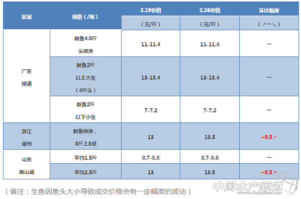 中國水產頻道獨家報道, 魚價穩中有升,好行情能持續到元宵節嗎? 文/圖 何氏水產、水產前沿 李靜 生魚 1.生魚的價格近幾個月一直突飛猛進,本周終于持穩。本周也將迎來今年第一次節后消費疲軟,目前4斤魚頭統貨11-11.4元/斤,2斤以上魚頭價格為13-13.4元/斤,2斤以下魚頭價格為7-7.2元/斤,依然是按規格大小定價格。這周行情預估會有小幅波動。 2.其他地區的價格目前變化不大。 各地區生魚出塘價 【關鍵字】:生魚出塘價 水產養殖 |