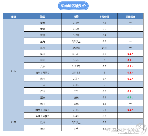 中國(guó)水產(chǎn)頻道獨(dú)家報(bào)道, 養(yǎng)得好,不如賣(mài)得好 全國(guó)草魚(yú)行情解析, 中國(guó)水產(chǎn)頻道與您相約每周二 文/圖 水產(chǎn)前沿 鄭鵬飛 春回大地,萬(wàn)物復(fù)蘇!本周大部分地區(qū)都是艷陽(yáng)高照的好天氣,隨著天氣逐漸回暖,草魚(yú)供應(yīng)趨向穩(wěn)定,價(jià)格行情整體穩(wěn)中有升。雖然局部地區(qū)仍然表現(xiàn)出行情波動(dòng),但是從整體上看,本周華南地區(qū)基本保持穩(wěn)定并有小幅上漲,北方地區(qū)價(jià)格有小幅回落。其中,廣西賀州地區(qū)2-4斤草魚(yú)從上周的6.5元/斤漲到了7元/斤,為本周漲幅最大;山東地區(qū)草魚(yú)苗上漲明顯,目前20尾/斤規(guī)格的已經(jīng)賣(mài)到7元/斤,比月初時(shí)的5.5元/斤有1.5元的上漲。 華南地區(qū) 佛山:最新了解到,佛山地區(qū)超市鯇塘頭價(jià)6.5元/斤,3斤以上的7元/斤,6斤的草魚(yú)8.6元/斤,8斤的8.8元/斤。 肇慶:肇慶地區(qū)統(tǒng)鯇塘頭報(bào)價(jià)6.7-6.8元/斤,較上周的7元/斤有0.2-0.3元的回落。 廣州:番禺地區(qū)目前2斤左右的6.6元/斤,較上周繼續(xù)上漲0.1元,5斤左右的塘頭價(jià)8元/斤。了解到,海鷗島1斤以上羅非價(jià)格再次上漲0.3元,目前已經(jīng)賣(mài)到6.3元/斤,增城2斤左右的塘頭價(jià)已經(jīng)賣(mài)到了6.7元/斤。 梅州:有養(yǎng)殖戶反映,目前梅州地區(qū)2斤以上草魚(yú)已經(jīng)賣(mài)到8元/斤,較上周上漲0.3元。 中山:目前中山脆肉鯇由于存貨不多,賣(mài)魚(yú)火熱,正是一年中魚(yú)中最忙的時(shí)候。脆肉鯇價(jià)格行情繼續(xù)維持在上周的水平,13斤以上的塘頭價(jià)14.5元/斤。目前坦洲地區(qū)3斤以上草魚(yú)的7元/斤,4斤起的7.6元/斤,5斤起的已經(jīng)賣(mài)到了8.1元/斤,6斤起的目前塘頭價(jià)8.8-9元/斤,超市鯇維持6.5元/斤。板芙地區(qū)統(tǒng)鯇6.5-6.6元/斤,超市鯇6.3元/斤。 江門(mén):本周江門(mén)地區(qū)草魚(yú)價(jià)格整體保持穩(wěn)定,部分地區(qū)有0.2元左右的下滑。目前鶴山地區(qū)3斤的塘頭價(jià)7.3元/斤,維持穩(wěn)定,而5斤以塘頭價(jià)7.8元/斤,較上周有0.2元的下滑。江門(mén)新會(huì)地區(qū)統(tǒng)鯇塘頭價(jià)6.5元/斤,維持穩(wěn)定。 貴港:廣西地區(qū)的草魚(yú)價(jià)格整體上維持穩(wěn)定,2-4斤塘頭價(jià)穩(wěn)定在6.1-6.5元/斤之間。貴港地區(qū)價(jià)格穩(wěn)定在上周水平,塘頭價(jià)6元/斤。 南寧、桂林:廣西南寧地區(qū)草魚(yú)價(jià)格維持穩(wěn)定,目前2-4斤草魚(yú)塘頭價(jià)為6.4元/斤,廣西桂林地區(qū)草魚(yú)塘頭價(jià)穩(wěn)定在6.3元/斤。 賀州:正如之前我們所預(yù)測(cè)的,廣西地區(qū)統(tǒng)鯇一定能突破7元/斤。目前賀州地區(qū)2-3斤草魚(yú)塘頭價(jià)已經(jīng)漲到了7元/斤,再次上漲0.5元,為本周漲幅最大地區(qū)。 華中地區(qū) 江西:本周江西南昌地區(qū)2斤左右的草魚(yú)塘頭價(jià)漲到了5.6-5.8元/斤,較上周有0.3-0.5元的上漲,養(yǎng)殖戶對(duì)目前的價(jià)格還是比較滿意。目前江西樟樹(shù)地區(qū)草魚(yú)不是很好賣(mài),塘頭價(jià)維持在5.5.元/斤。 湖南:湖南益陽(yáng)地區(qū)2-4斤草魚(yú)目前塘頭價(jià)穩(wěn)定在5.6-5.8元之間,較上周有小幅上漲。湖南邵陽(yáng)地區(qū)草魚(yú)價(jià)格維持穩(wěn)定,常德地區(qū)草魚(yú)價(jià)格有小幅上漲,岳陽(yáng)地區(qū)3斤左右的塘頭價(jià)6.5元/斤,較上周有小幅上漲。湘陰地區(qū)2斤左右草魚(yú)價(jià)格有下降趨勢(shì),養(yǎng)殖戶不太想賣(mài)。 湖北:了解到,本周湖北地區(qū)草魚(yú)行情整體保持穩(wěn)定,目前鄂州地區(qū)2斤左右的塘頭價(jià)維持6元/斤,近期沒(méi)有太大波動(dòng)。 河南:由于上周價(jià)格波動(dòng)較大,本周開(kāi)封地區(qū)2-4斤草魚(yú)塘頭價(jià)從上周的7元/斤回落到6.6元/斤。 華東地區(qū) 江蘇:了解到本周江蘇地區(qū)草魚(yú)價(jià)格有小幅下滑,其中徐州地區(qū)草魚(yú)價(jià)格有0.2元左右的下滑,江蘇南通地區(qū)草魚(yú)價(jià)格也是有小幅下滑,目前4斤以上的6.6元/斤,5斤起的6.9元/斤。 福建:福建三明地區(qū)目前3斤左右草魚(yú)的報(bào)價(jià)為6.8元/斤,相比上周有0.3元的上漲。福建南平地區(qū)草魚(yú)下滑趨勢(shì)有所減緩,較上周有0.1元左右的下滑,目前3斤左右的草魚(yú)塘頭價(jià)6.5元/斤。 安徽:本周安徽地區(qū)草魚(yú)價(jià)格沒(méi)有太大波動(dòng),基本維持在上周水平。 重慶:了解到目前墊江地區(qū)本地的成魚(yú)不多,2-4斤的草魚(yú)塘頭價(jià)穩(wěn)定在6.5元/斤。銅梁地區(qū)草魚(yú)價(jià)格整體維持上周水平,養(yǎng)殖戶反映目前的價(jià)格不是很穩(wěn)定,暫時(shí)還存在波動(dòng)。 天津:本周天津地區(qū)的草魚(yú)行情較上周有0.3-0.5元的下滑,目前2.5斤以上的草魚(yú)塘頭價(jià)在6.2-6.4元/斤之間,平均報(bào)價(jià)6.3元/斤。 四川:目前廣元地區(qū)的草魚(yú)價(jià)格穩(wěn)定在上周水平,塘頭價(jià)7元/斤。德陽(yáng)地區(qū)3斤左右的草魚(yú)目前塘頭價(jià)6.5元/斤,自貢地區(qū)塘頭價(jià)維持6元/斤。 遼寧:目前遼寧沈陽(yáng)地區(qū)2.5斤左右草魚(yú)塘頭價(jià)6.3元/斤,3-5斤的6.7元/斤,維持上周水平。了解到,目前沈陽(yáng)地區(qū)小草魚(yú)價(jià)格相對(duì)穩(wěn)定,成魚(yú)價(jià)格有小幅下滑。 陜西: