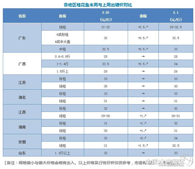 中國水產頻道獨家報道, 節后鱖魚不跌反漲,鱖魚及餌料魚雙雙上漲! 文/水產前沿李靜 春節過后,鱖魚消費市場逐漸恢復平靜,但鱖魚價格卻沒有因此而回落。 近日,廣東鱖魚持續上漲0.5元/斤,突破33元/斤。與去年同期25元/斤的價格相比,今年廣東鱖魚塘頭價整整高出了8元/斤!而與2011年同期20元/斤的價格相比,今年廣東鱖魚價格竟高出了13元/斤!這樣的差距讓人對今年8月份的鱖魚價格充滿期待。也正因養殖戶對今年鱖魚后市看好,故而目前多地養殖戶惜售心理明顯,而這又反過來促進了鱖魚價格的持續上漲。 截至今日,廣西、安徽等地的標桂已成功突破34元/斤,因當地養殖量不大,出魚量也不大,比如廣西地區,多依賴廣東鱖魚供給。另據業內人士反應,季節變化鱖魚容易發病,若屆時病魚沖擊市場,鱖魚價格或將受到一定程度的影響。 餌料魚行情分析 餌料魚:自春節餌料魚價格大幅飆升后,近日依然居高不下,但春耕時節馬上來臨,隨著養戶陸續清塘,大量餌料魚上市,屆時價格或將慢慢回落。 部分地區餌料魚價格:清遠麥鯪4.3元/斤、土鯪5.2元/斤、巴西雕3.8元/斤;肇慶麥鯪4.5―4.8元/斤、鳊魚4.3--4.5元/斤、新土鯪5.2-5.6元/斤、隔年土鯪4.5--4.8元/斤;佛山土鯪5.5-5.5元/斤;中山土鯪6元/斤;江門土鯪5.6元/斤、麥鯪+扁魚4.8元/斤;湖北鯽魚2.0元/斤、小草魚(一斤十五尾到二十尾)5.8-6元/斤。 【關鍵字】:鱖魚 廣西 安徽 水產養殖 |