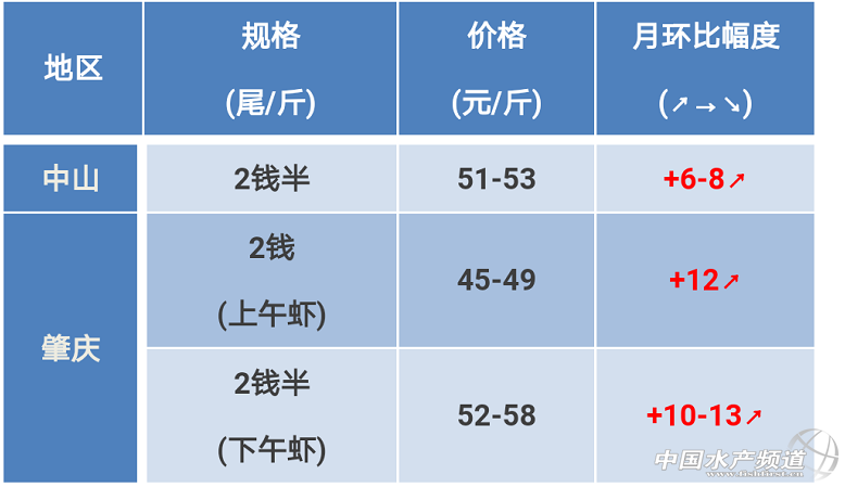 文/ 粵海飼料集團(tuán)、中國水產(chǎn)頻道 彭曉君 中國水產(chǎn)頻道原創(chuàng)獨家報道,肇慶區(qū)域:肇慶蓮塘上午蝦兩錢上45-49元/斤,下午蝦兩錢半52-58元/斤,下午蝦大部分成交價格54-56元/斤。白土金渡上午蝦兩錢上46元/斤左右,下午蝦兩錢半55元/斤左右;中山兩錢半51-53元/斤。 ※上述報價可能會因區(qū)域、規(guī)格、品質(zhì)和時間等因素的不同而會產(chǎn)生差異,在此僅供參考。本周月環(huán)比幅度價格對比時間為2月3日。 【關(guān)鍵字】:羅氏沼蝦 羅氏沼蝦價格 水產(chǎn)養(yǎng)殖 |
