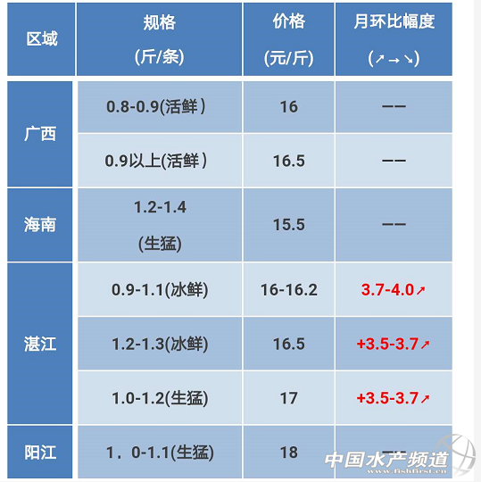 文/ 粵海飼料集團、水產前沿 彭曉君 中國水產頻道原創獨家報道,廣西區域:欽防最近一周沒有人出魚,價格無法統計。冰鮮價格:400/500:9.2-10元/斤、500/600:10-10.75元/斤、600/700:10.5-11元/斤、700/800:11-11.5元/斤。由于前段時間春節節慶魚價好,養戶出魚多,目前存塘魚少價較堅挺。 ※上述報價可能會因區域、規格、品質和時間等因素的不同而會產生差異,在此僅供參考。本周月環比幅度價格對比時間為2月3日。 【關鍵字】:金鯧魚 金鯧魚價格 水產養殖 |