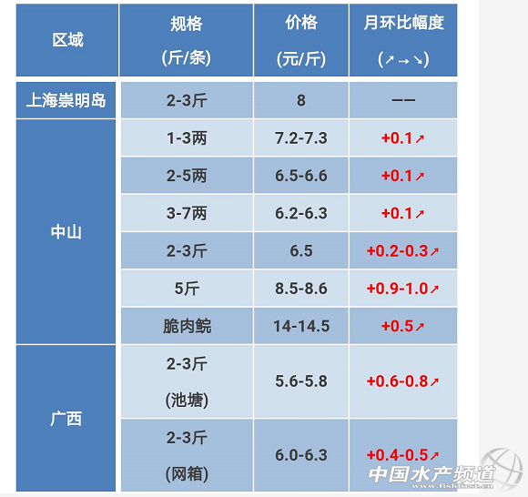 文/ 粵海飼料集團、水產前沿 彭曉君 中國水產頻道原創獨家報道,中山區域:小規格魚種價格上升處于高位;超市草魚近期市場銷量增加,價格上升;5斤以上存塘量少價格堅挺;氣溫回升,脆肉價格歷史高位。 上海區域:崇明島草魚2-3斤/條,報價8元/斤,較上周略有下降(下降0.1元/斤),價格處于高位。17年草魚價格較高,養殖戶出貨較多,存塘量降低。目前商品草魚仍然是搶手貨,價格相對穩定。 廣西區域:由于前段時間春節節慶魚價好,養戶出魚多,目前存塘魚少價較堅挺。 ※上述報價可能會因區域、規格、品質和時間等因素的不同而會產生差異,在此僅供參考。本周月環比幅度價格對比時間為2月3日。 【關鍵字】:草魚 草魚價格 水產養殖 |