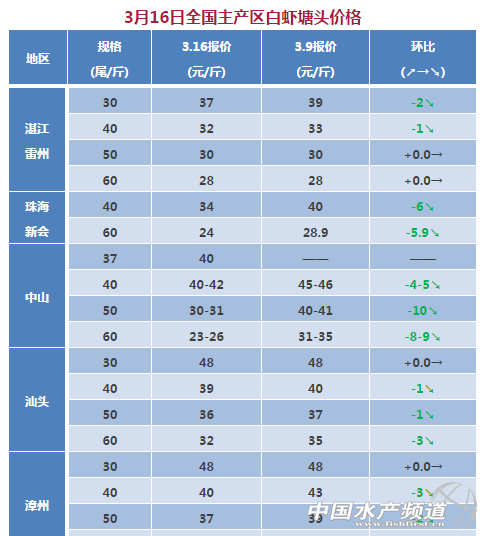 中國水產頻道獨家報道, 文/粵海飼料集團、中國水產頻道 彭曉君 各產區白對蝦一周價格分析 湛江、海口:本周蝦價小幅回落,本階段受節日消退影響,市場需求有所減少,近期蝦價可能小幅回落。 珠海新會:蝦價持續下跌6~7元/斤,因價格下跌并趕時間下棚尾批,養殖戶已紛紛出蝦。大部分已清塘及下苗。 廣西北海:目前廣西冬棚蝦出蝦較少,報價暫停。養殖狀況:今年冬棚養殖情況較去年穩定,但由于今年水溫較去年低,冬蝦吃料少,長速比去年慢,估計今年冬蝦出蝦比往年推遲,預計在清明前后僅有少量上市,集中上市會要推遲至5月、6月份(白水蝦上市前)。近期天氣比較好,早春白水蝦投苗進行比較火熱:投苗比較早的黨江漁江,更樓投苗已高達7~8成,相對遲的黨江區域南域、木案、沙涌、馬頭等地投苗率約2-3成,北海整體約3-4成投苗、欽防以浙江人為主的也陸續回來開始準備工作,逐步開始投苗。目前早投苗的養殖不太穩定,部分十幾天的苗已出問題,而且由于水溫低的原因長速也比去年同期要慢。 中山:橫欄37尾40元,50尾浸籠30元;港口60尾23元;容桂均安40尾42元,50尾36元;東升沙朗50尾浸籠31元,60尾26元。中山存塘量少,出蝦浸籠為主。 汕頭:主要為高位池冬棚蝦,蝦規格主要在50-80尾,40尾以上大規格蝦少。蝦存塘量減少,病害增加,價格略有下跌,同比上周下跌1-3元/斤。 漳州:高位池蝦養殖存塘蝦少;春節期間,市場上蝦需求量增加,出蝦量大;春節后,蝦量減少,病害增加,價格略有下跌,同比上周下跌1-3元/斤。 (多個主產區無成蝦出塘,成交量低,暫停報價) 上述報價可能會因區域、規格、品質和時間等因素的不同而會產生差異,在此僅供參考。 【關鍵字】:對蝦 塘頭價 水產養殖 |