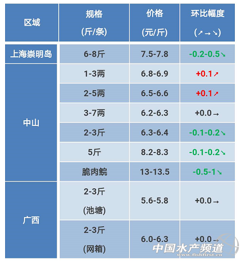 文/ 粵海飼料集團、中國水產頻道 彭曉君 中國水產頻道原創獨家報道,中山區域:小規格魚種價格高位回落;超市草魚近期市場銷量增加,價格回落;5斤以上存塘量少價格堅挺;氣溫回升,脆肉價格高位回落。 上海區域:崇明島草魚6-8斤/條,報價7.5-7.8元/斤,較上周價格略有下降(下降0.2-0.5元/斤),屬于正常價格波動,正月過后需求量略有下降,價格正;卣{,近期還會有小幅回調。 廣西區域:目前氣溫回暖,草魚供需穩定,價格經過近幾周的上升后逐漸企穩。 ※上述報價可能會因區域、規格、品質和時間等因素的不同而會產生差異,在此僅供參考。 【關鍵字】:草魚 草魚價格 水產養殖 |