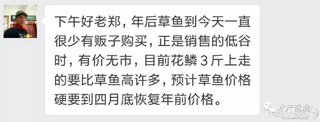 中國水產頻道獨家報道, 養得好,不如賣得好 全國草魚行情解析, 中國水產頻道與您相約每周二 文/圖水產前沿鄭鵬飛 每年年后的一段時間淡水魚市場消費總會出現一定程度的疲軟,被稱之為魚價行情的“節后綜合癥”。具體表現有:首先是消費量減少,節后重慶井口市場的銷量相比年前減少了四分之一,不過目前日交易量已經逐漸恢復到30-40萬斤。其次是價格波動大,無論是廣州的環球市場,武漢白沙洲市場還是重慶井口市場,都不同程度上感受到亂市現象,目前2-3斤草魚在重慶井口市場的價格波動幅度就達到1元,報價范圍在5.5-6.5元/斤之間。第三是價格下滑,及時不下滑也存在有價無市的現象,魚中收魚減少,年后這一個多月時間內大部分地區草魚價格都有不同程度下滑,其中湖北大草魚最高下滑了1元/斤。也有也內人士表示,近期草魚行情的下滑在一定程度上受到集中出魚和豬價下滑的影響。因為近期很多魚塘都開始放苗,年前屯的魚很多集中上市,再加上豬肉更便宜了以及近期拆網箱的影響,所以加推了魚價的下行。即使這樣,目前的魚價行情仍然比較樂觀,各地草魚價格整體維持穩定,部分地區仍有上漲。大部分養殖戶對后期行情表示期待,預計清明后草魚行情有望再次上漲。 華南地區 雖然市場相對疲軟,但是目前華南草魚價格整體上還是保持平穩,部分地區有0.1-0.2元的小幅下滑。對于清明后價格行情,大部分人表示華南地區的行情有可能會繼續穩定或有小幅下滑,預計5月以后會有所回升。 中山:目前各地放苗需求旺盛,大規格苗種仍然是供不應求,中山黃圃草魚苗種價格仍然保持高位運行,1-3兩的塘頭價7.3元/斤。近期水溫上升,夠規格的魚存塘增加,市場略微疲軟,價格有下滑趨勢,成魚價格有0.1-0.2元的下滑,13斤以上脆肉鯇回落到14元/斤。 江門:本周鶴山地區草魚塘頭價6元/斤,繼續保持穩定。 梅州:了解到,現在是放苗時間,梅州地區塘里很少有3-6斤的大魚,目前塘頭價6.7元,零售9元。目前拆網箱,福建魚中很少會到梅州,估計6月30之后價格回升可能性比較大,清明大草魚價格會有所回暖。目前梅州草魚價格穩定,沒有出現漲跌,預計清明后會回升。 肇慶:有養殖戶表示昨天剛剛出魚塘頭價6元/斤,預計還會掉價;目前2斤左右的6.2-6.3元,清明后價格波動不會太大,雖然很多地方禁養,但是人們養殖技術提高了,很多人養殖都是高投入高產出,而且目前豬價大幅回落相對會影響到魚價。 佛山:因為新魚開始上市,應該還會緩慢下跌,目前佛山地區草魚塘頭價為6.1元/斤。 廣州:廣州地區統鯇塘頭價6.4元/斤,目前價格保持穩定。有業內人士表示,年后放苗最后一波,集中出魚加上消費下降,近期魚價預計會有小幅下降,清明后預計會有所回升。 東莞:目前價格疲軟是因為養殖戶魚塘進苗或者高密度屯魚,導致大量拋售,因為消費又起來了,行情應該會走強。 廣西:從貴港養殖戶了解到,每年5月份草魚行情都會起價,目前貴港地區塘頭價5.8-6元/斤。本周桂林地區草魚價格沒有出現變化,保持在上周的6.3元/斤,有業內人士表示預計7月前價格不會有太大變動。 華南地區塘頭價