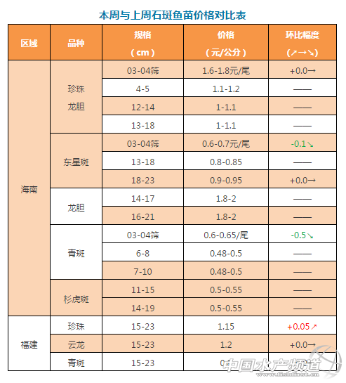 中國水產頻道獨家報道, 文/ 海南晨海水產有限公司 萊州明波水產有限公司 三通生物工程(濰坊)有限公司 水產前沿吳佳輝 養殖要豐產,更要豐收 石斑、斑石鯛 塘頭最新報價周四見! 石斑魚 福建:本周石斑魚報價,規格統一在1-2斤,石斑魚價格波動較小。但市場上1.3-2斤的價格會比1.1-1.2斤的高1-2元/斤。 山東萊州:珍珠龍膽商品魚養殖存池量很少。 石斑魚苗 海南:本周苗價與上周相差不大。由于大部分苗場的珍珠產卵期都在月底(農歷),本周珍珠卵量極低,基本上沒有卵。 福建:13cm以上的過冬苗已進入大規模銷售階段。 山東萊州:育苗本周已經開始,集中出苗應該在5月中旬。 【關鍵字】:石斑魚 塘頭價 水產養殖 |