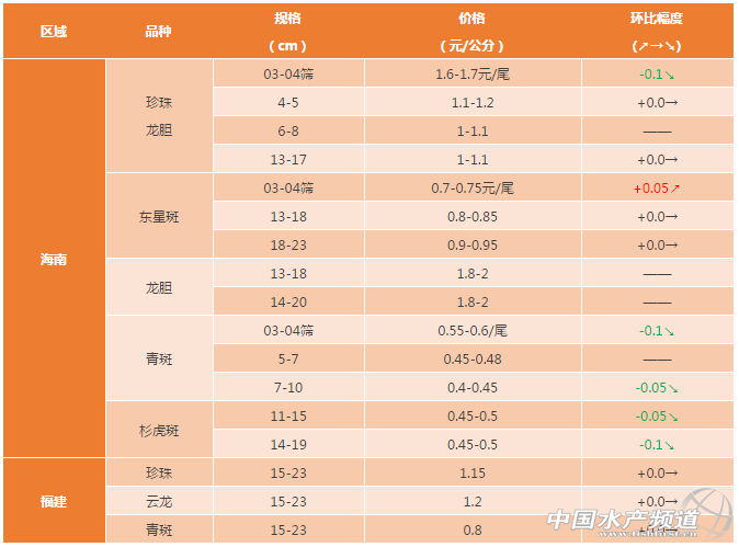 文/ 海南晨海水產(chǎn)有限公司 萊州明波水產(chǎn)有限公司 三通生物工程(濰坊)有限公司 中國水產(chǎn)頻道 吳佳輝 石斑魚 中國水產(chǎn)頻道原創(chuàng)報道,海南:這段時間石斑魚價格有所下跌,清明這段時間價格最不穩(wěn)定,價格會波動一段時間。由于石斑魚存塘量不大,之后的價格應(yīng)該還是維穩(wěn)。相比去年同期,3-4斤的石斑魚價格有所下降,但其他的魚價都比較理想。 山東萊州:本周石斑魚價與上周持平,珍珠龍膽商品魚養(yǎng)殖存池量很少。 本周與上周石斑魚價格對比表 石斑魚苗 福建:福建:過冬青斑、珍珠、云龍苗都已經(jīng)進入放苗階段,珍珠卵也陸陸續(xù)續(xù)孵化,早的距今也差不多快10天,但還沒到過篩出苗階段。本地的云龍石斑卵目前已開始產(chǎn)卵。總的來說,當(dāng)前已進入正常的生產(chǎn)投苗階段。 山東萊州:育苗已經(jīng)開始,集中出苗應(yīng)該在5月中旬。 本周與上周石斑魚苗價格對比表 【關(guān)鍵字】:石斑魚 石斑魚價格 水產(chǎn)養(yǎng)殖 |