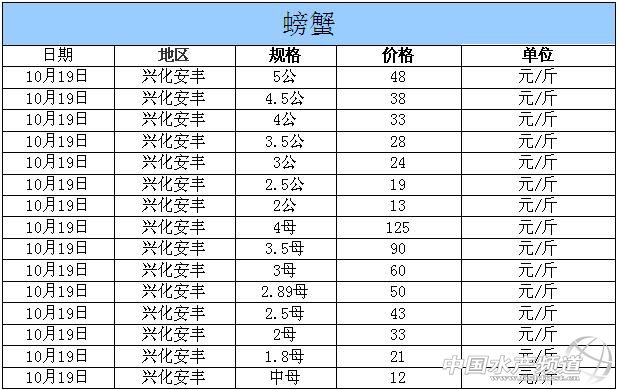 中國水產頻道獨家報道,據網友提供消息,2014年10月19日江蘇興化安豐河蟹價格行情如下: