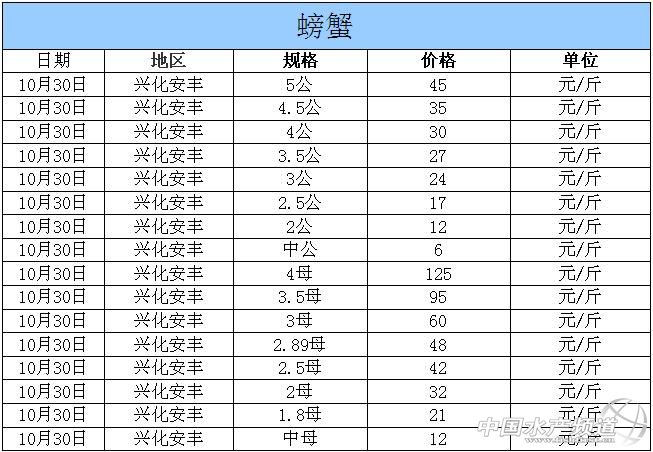 中國水產頻道獨家報道,據網友提供消息,2014年10月30日江蘇興化安豐河蟹價格行情如下: