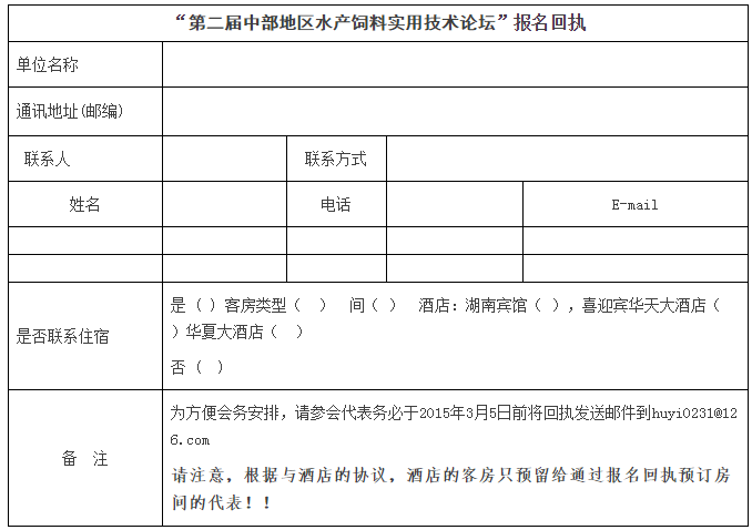 “第二屆中部地區水產飼料實用技術論壇”報名回執