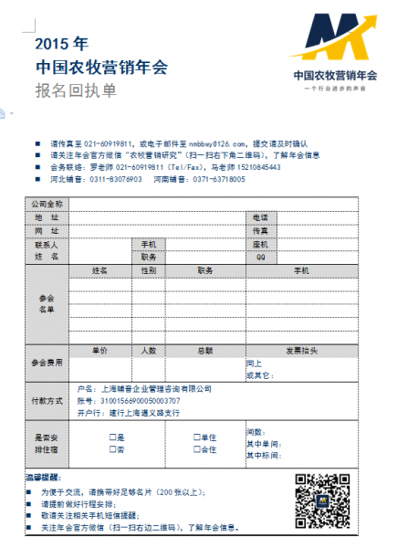 附:《2015·中國農(nóng)牧營銷年會報名回執(zhí)》