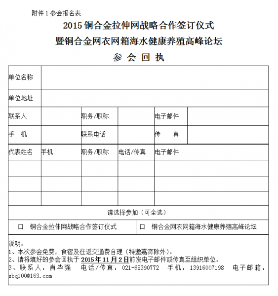 銅合金拉伸網是近岸和離岸海水養殖的理想材料,其優異的材料特性摒棄了傳統尼龍網衣易破損、易受污、大量使用抗生素、維護成本高等弊端,至此2015中國國際漁業博覽會之際,中國銅業有限公司、中國水產科學研究院東海水產研究所、國際銅業協會為進一步提高銅拉伸網在海水養殖行業的應用升級,特舉辦銅合金拉伸網戰略合作簽訂儀式暨銅合金網衣網箱海水健康養殖高峰論壇,屆時來自國內外的政府官員、專家學者、企業精英、行業媒體將匯聚一堂,分析發展策略、展示研究成果、分享發展經驗、尋求合作商機。
