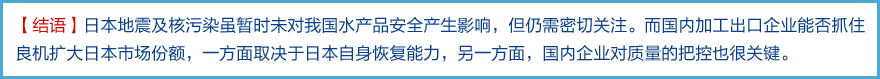 日本核泄消息傳出后,多國宣布限制從日本受核輻射影響地區進口農產品,而日本東北部水產養殖陷于低谷,難以滿足本國對水產品的需求,必將刺激各國對加大對日出口,世界水產貿易或將出現新的格局。