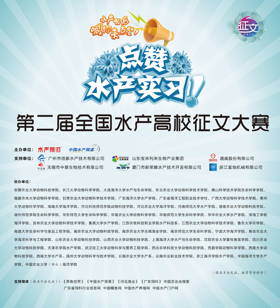 第二屆全國水產(chǎn)高校征文大賽是中國水產(chǎn)高校群體中規(guī)模最大的征文大賽。由《水產(chǎn)前沿》雜志及中國水產(chǎn)頻道網(wǎng)站主辦,于2014年5月攜手全國50所水產(chǎn)院校及6家知名企業(yè)共同發(fā)起,力邀8大名企高管擔(dān)綱評(píng)委,自上線以來受到業(yè)界及全國水產(chǎn)高校師生的廣泛關(guān)注。
