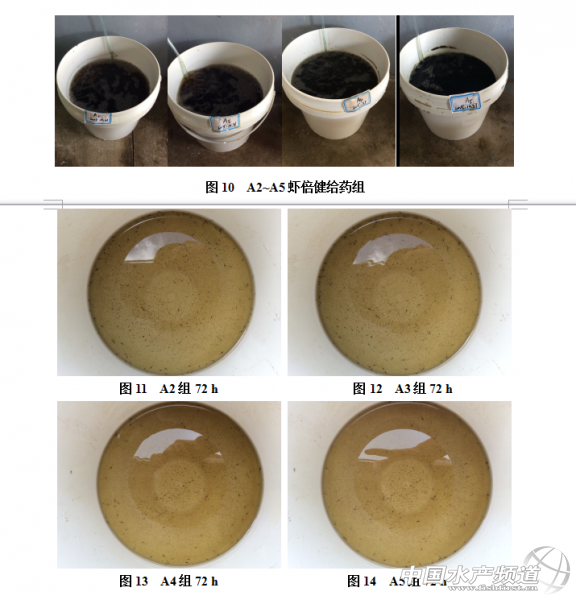 2、結果 使用0.05~1 g/L不同濃度蝦倍健進行水體消毒,在長達72 h的觀察期內,均未發現仔蝦蝦苗胃腸道、肝臟等器官發生病變,在全程未投料的情況下,仍能保持胃腸道的基本飽滿,并且表現出良好的活力。全程只有1 g/L 蝦倍健組損失了約10%的蝦苗,其余蝦倍健組均未見蝦苗死亡,存活率100%。結果見圖10~14。
