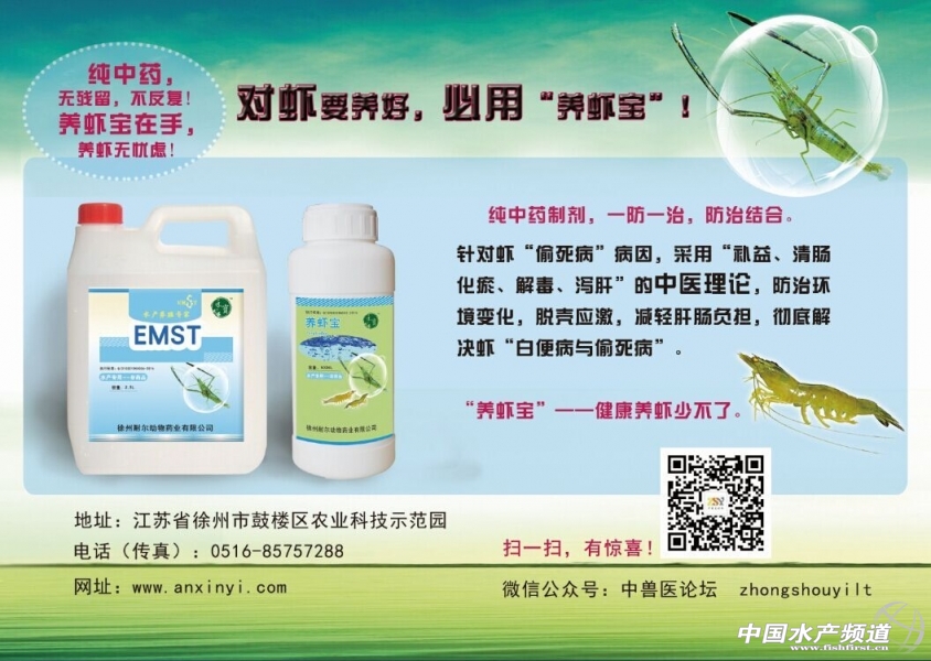 “白便”是蝦偷死病的前期,一旦發(fā)現(xiàn)“白便”,蝦開(kāi)始減食厭食,靠水塘岸邊,或浮游在水面上。肝胰腺萎縮,空腸胃,大量死亡。經(jīng)過(guò)2年多的探討、反復(fù)試驗(yàn),純中藥口服液制劑“養(yǎng)蝦寶”可起到較好的預(yù)防和早期“白便”治療效果,“養(yǎng)蝦寶”可在蝦10-60日齡易感期,經(jīng)常潑灑使用,或在見(jiàn)“白便”期間,大量連續(xù)使用,效果較好,是目前預(yù)防蝦偷死病和早期“白便”效果最好的藥物。一旦發(fā)現(xiàn)蝦浮游在水面或靠水塘岸邊,可迅速沿蝦浮游的水面或岸邊潑灑“EMST",并查看水質(zhì),發(fā)現(xiàn)水質(zhì)變壞,可換水40-60%,減少喂料,待蝦疾病恢復(fù)時(shí)增加喂料,并更換“養(yǎng)蝦寶”幫助體質(zhì)恢復(fù)。
