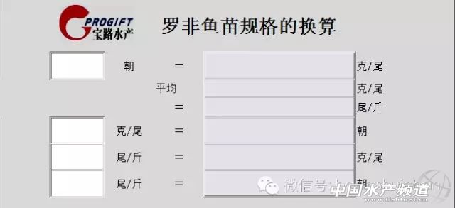 關于魚苗規格,不同的區域有不同的叫法,主要有朝數、克/尾及尾/斤等。為了保障魚苗規格整齊,苗場都用魚篩進行分苗操作,也就按“朝”這個規格來表示魚苗的大小。然而對養殖戶來說,“朝”是一個相對模糊的量度,難以確認。為此作者收集了大量數據并進行了分析,發現朝與魚苗體重之間有一定的關系,于是做了一個計算器,以方便廣大養殖戶對不同方式的規格進行換算。由于不同魚類的體型不一樣,所以本計算只適用于羅非魚苗。