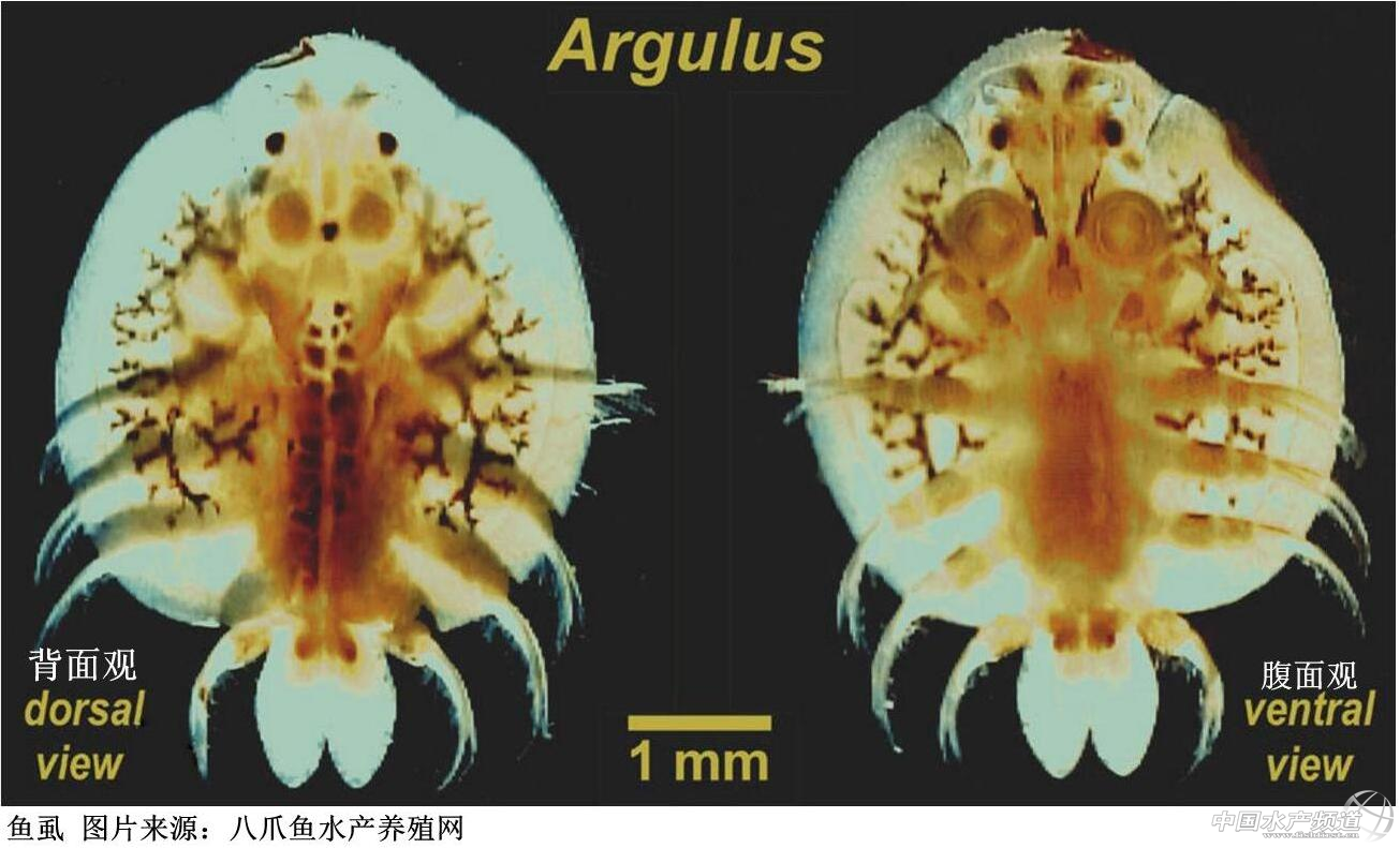 魚(yú)虱(Argulus)和縮頭魚(yú)虱實(shí)際上是分類地位較遠(yuǎn)的兩種寄生蟲(chóng),魚(yú)虱處于甲殼動(dòng)物亞門下的鄂足綱,縮頭魚(yú)虱則是軟甲綱,兩者在大小上也差別很大,魚(yú)虱只有5-8mm,幼蟲(chóng)時(shí)體小透明,肉眼較難觀察得到。