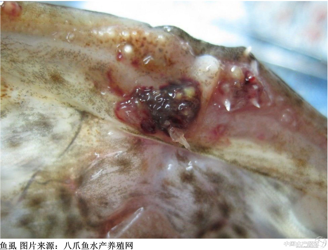 魚(yú)虱可以寄生在石斑魚(yú)的體表、口腔和鰓上,利用其口前刺刺入石斑魚(yú)體表并注入毒液,造成魚(yú)體表產(chǎn)生炎癥和出血,吸食血液。魚(yú)虱腹部有許多倒刺,在魚(yú)體上爬動(dòng)時(shí)也會(huì)造成傷口。被魚(yú)虱寄生的石斑魚(yú)口腔或體表出現(xiàn)成片的紅瘡,嚴(yán)重時(shí)感染潰爛。