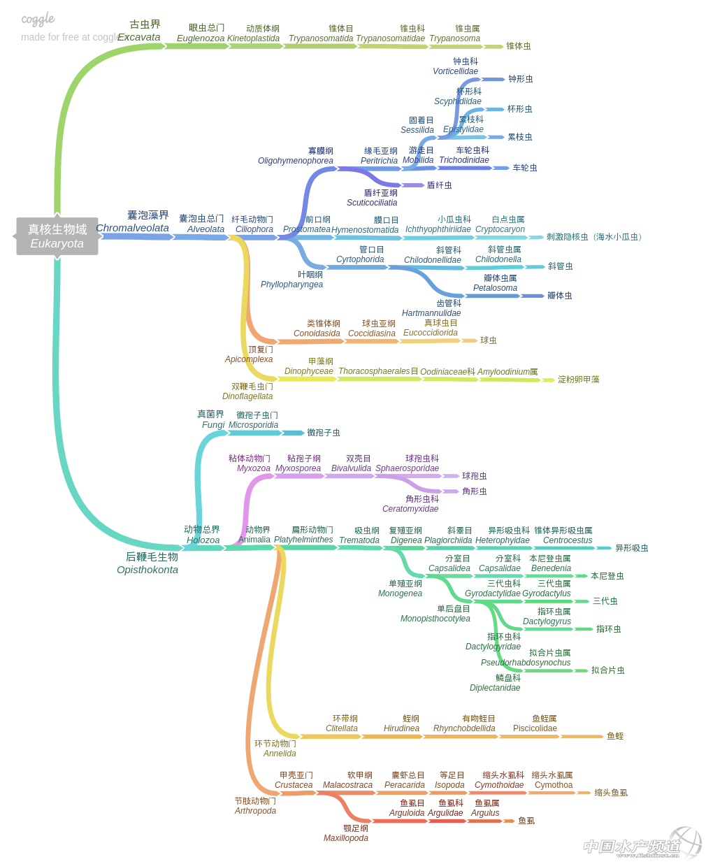 圖中寄生蟲(chóng)的分類地位是通過(guò)網(wǎng)站EOL(Encyclopedia of live)查詢獲得,大類上采用2005年“國(guó)際原生生物學(xué)家協(xié)會(huì)”提出的六界說(shuō),將真核生物分成古蟲(chóng)界、變形蟲(chóng)界、后鞭毛生物、有孔蟲(chóng)界、囊泡藻界 、泛植物界,取消了傳統(tǒng)的原生生物界,細(xì)支上多數(shù)采用NCBI分類法,然而并沒(méi)有統(tǒng)一的分類標(biāo)準(zhǔn),分類學(xué)為一門復(fù)雜的學(xué)科,有錯(cuò)的地方還望專家見(jiàn)諒。